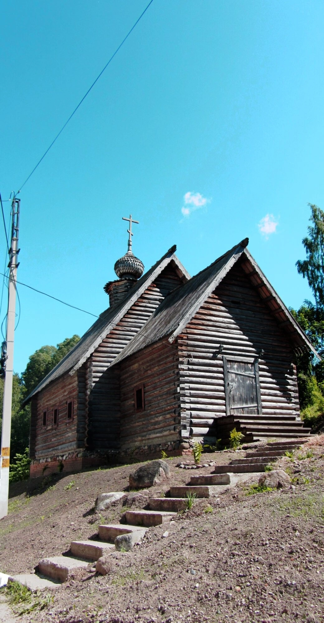 На представленной фотографии запечатлена деревянная часовня в честь Архангела Михаила, расположенная в древнем городе Плёс Ивановской области. Этот памятник православной архитектуры находится на склоне холма в живописном месте с координатами 57.46049000 северной широты и 41.51115800 восточной долготы.