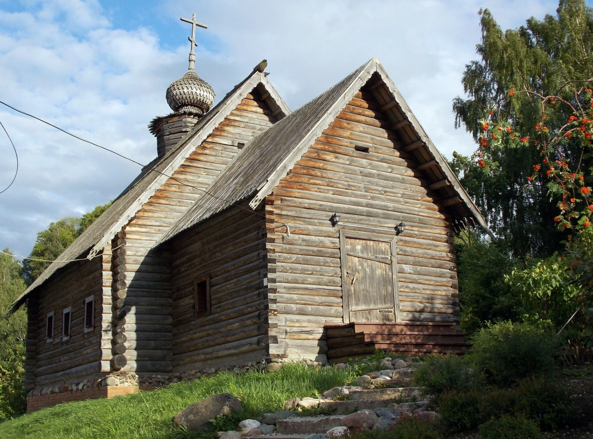 На представленной фотографии запечатлена деревянная часовня во имя Архистратига Божия Михаила, расположенная в древнем городе Плёсе Ивановской области. Данная святыня была перенесена из близлежащей деревни Антоново, что сохранило для потомков уникальный образец православного деревянного зодчества.