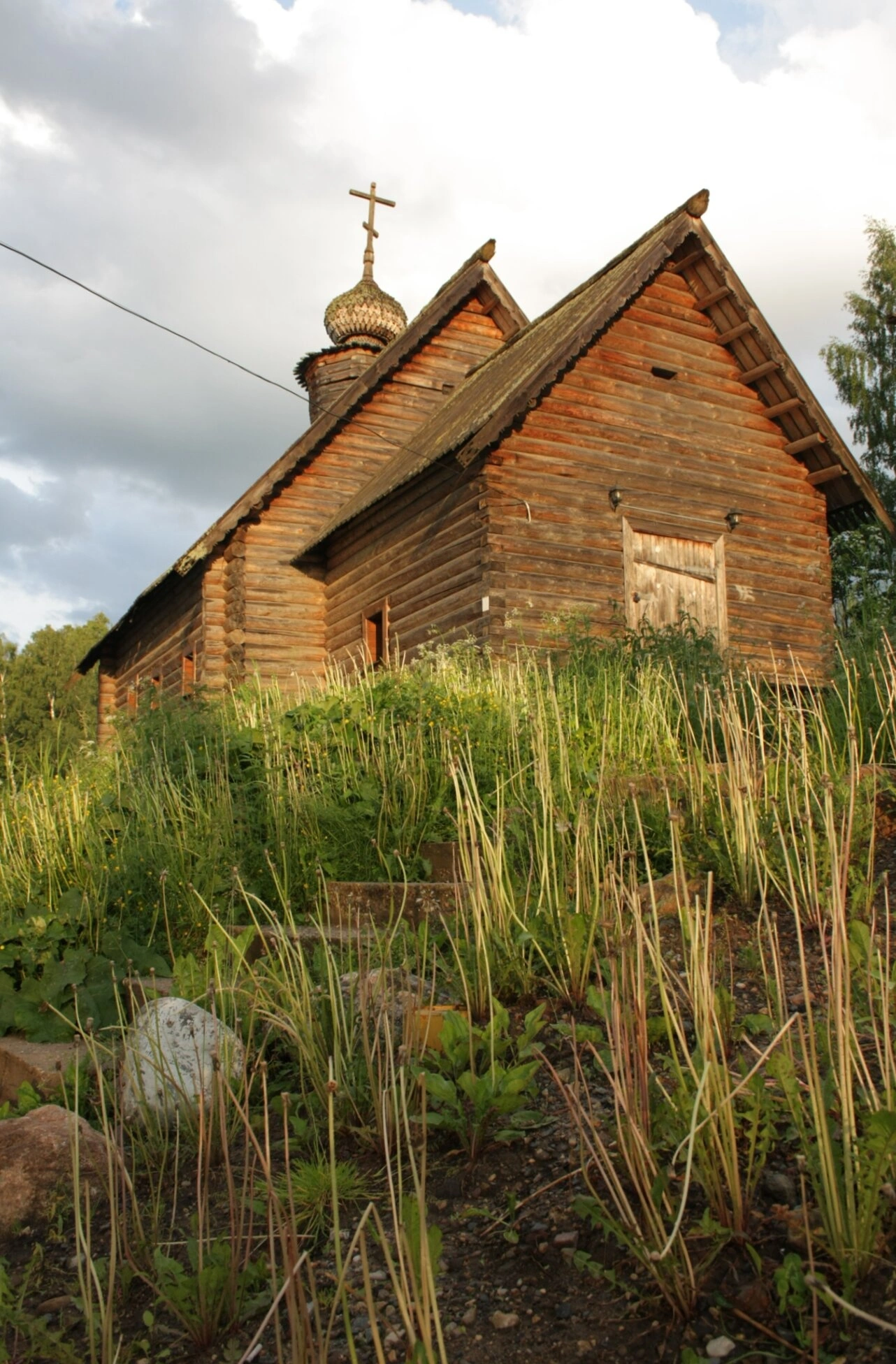 Ракурс съёмки, выбранный фотографом, позволяет оценить вертикальную композицию сооружения и его органичное вписывание в природный контекст. Естественное дневное освещение подчёркивает текстуру дерева и создаёт благоговейное настроение, соответствующее назначению данного сакрального пространства.
