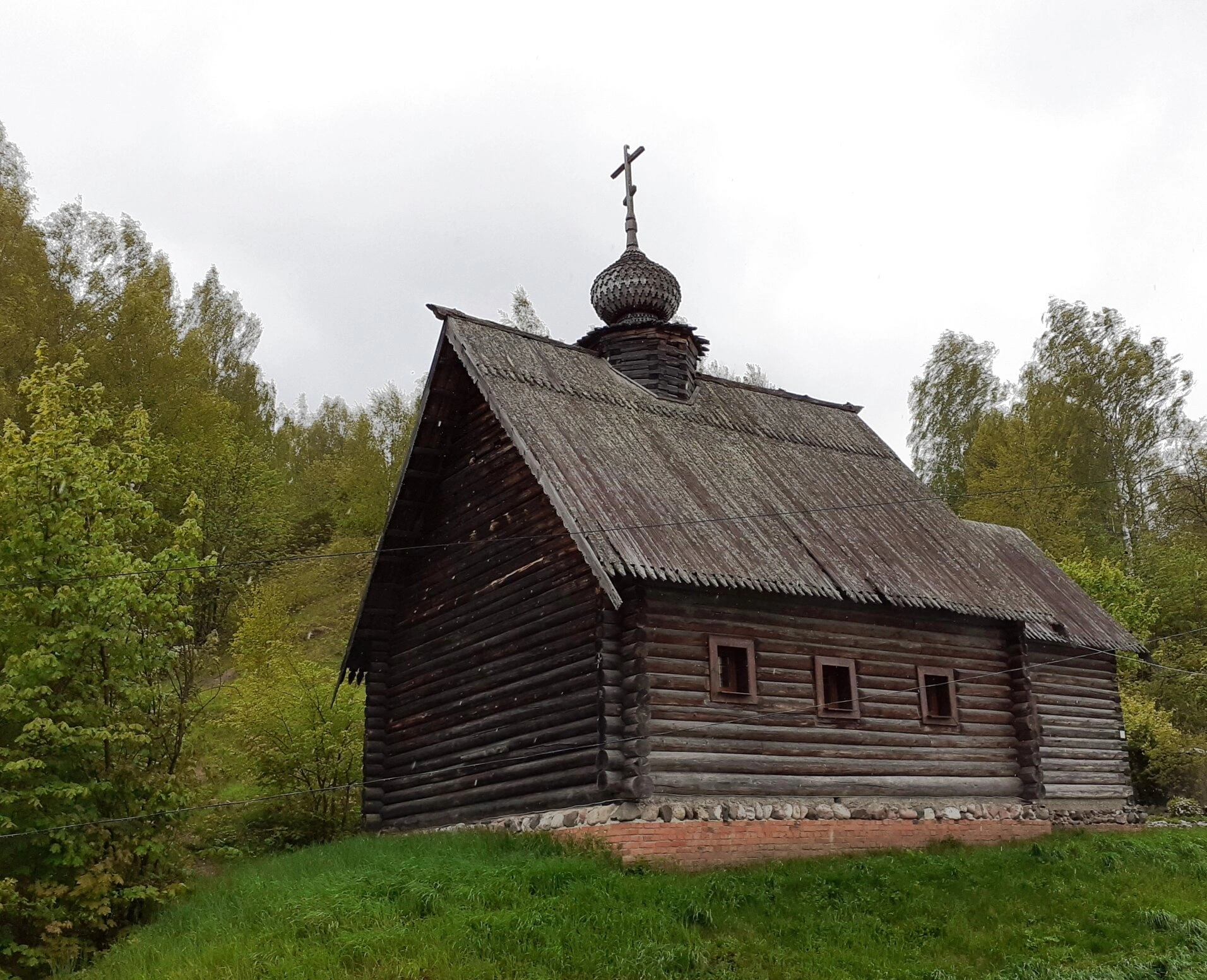 Кровля часовни выполнена из деревянных пластин, также потемневших от времени, что создает единый гармоничный образ старинной православной святыни. Часовня установлена на невысоком кирпичном фундаменте на вершине живописного холма, поросшего травой. Окружающий ландшафт дополняют лиственные деревья, обрамляющие часовню и создающие естественное природное обрамление для этого духовного места.