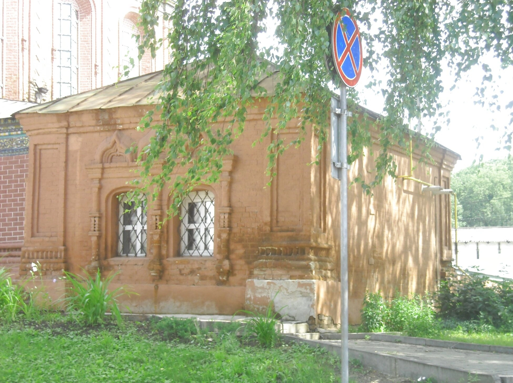 На представленной фотографии запечатлена часовня Богоявления, расположенная в исторической части Ярославля на территории архитектурного ансамбля Церкви Богоявления. Данная часовня представляет собой небольшую кирпичную постройку, выполненную в традициях русского церковного зодчества и окрашенную в благолепный красный цвет.