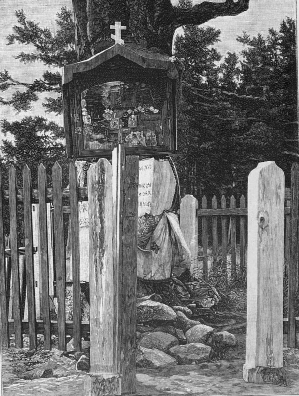 На представленной гравюре запечатлена часовня Церкви Святого Петра, располагавшаяся в историческом районе Лахта в Санкт-Петербурге. Центральным элементом композиции является деревянный киот традиционной православной формы, увенчанный Святым Крестом. Под двускатной кровлей этого малого храма размещены иконы, предназначенные для молитвенного поклонения верующих.