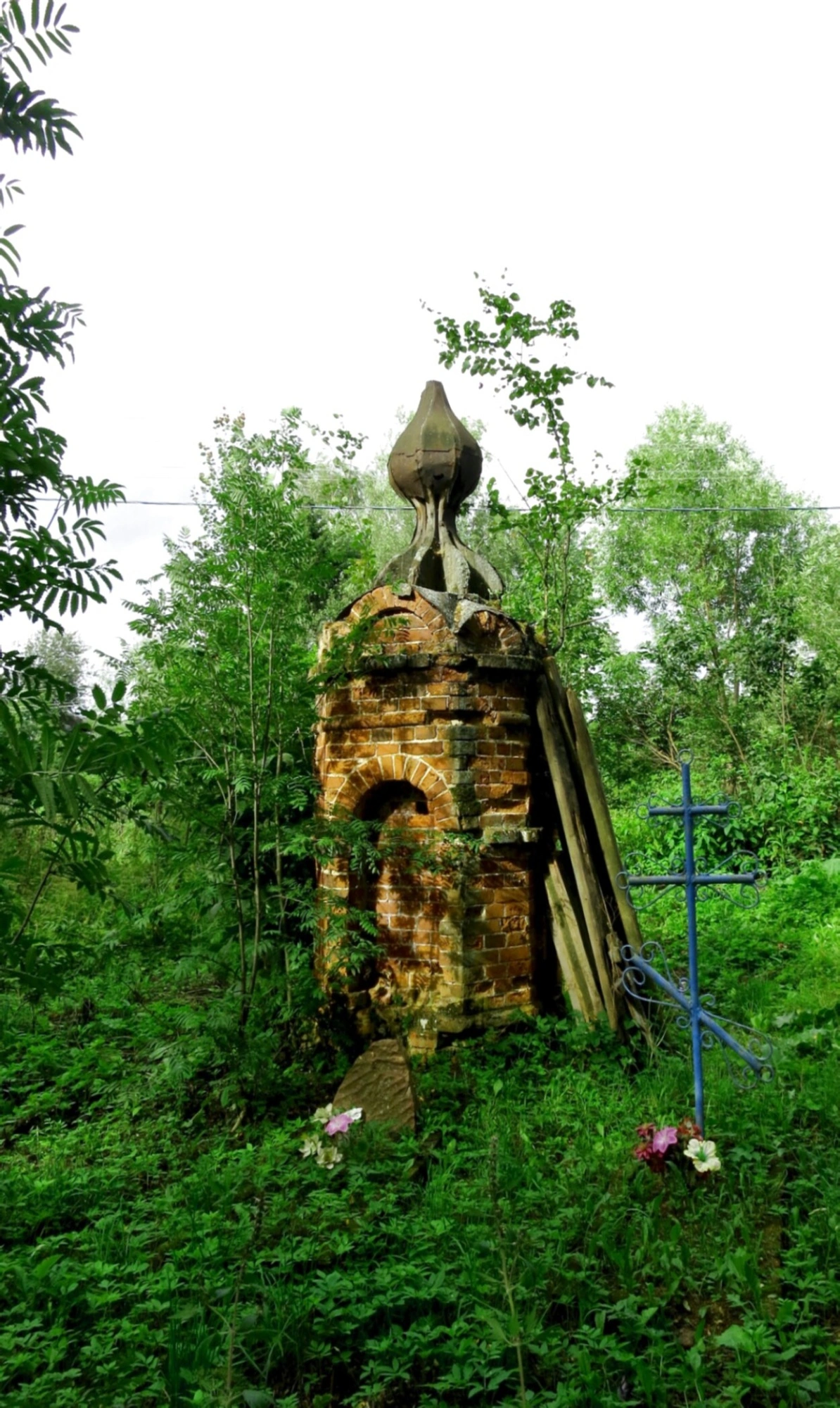 На представленной фотографии запечатлена небольшая кирпичная часовня, относящаяся к комплексу Церкви Троицы Живоначальной в селе Турбичево Дмитровского района Московской области. Сооружение, выстроенное из красного кирпича, находится в сильно повреждённом и заброшенном состоянии, что указывает на долгие годы запустения этого некогда действующего православного объекта.