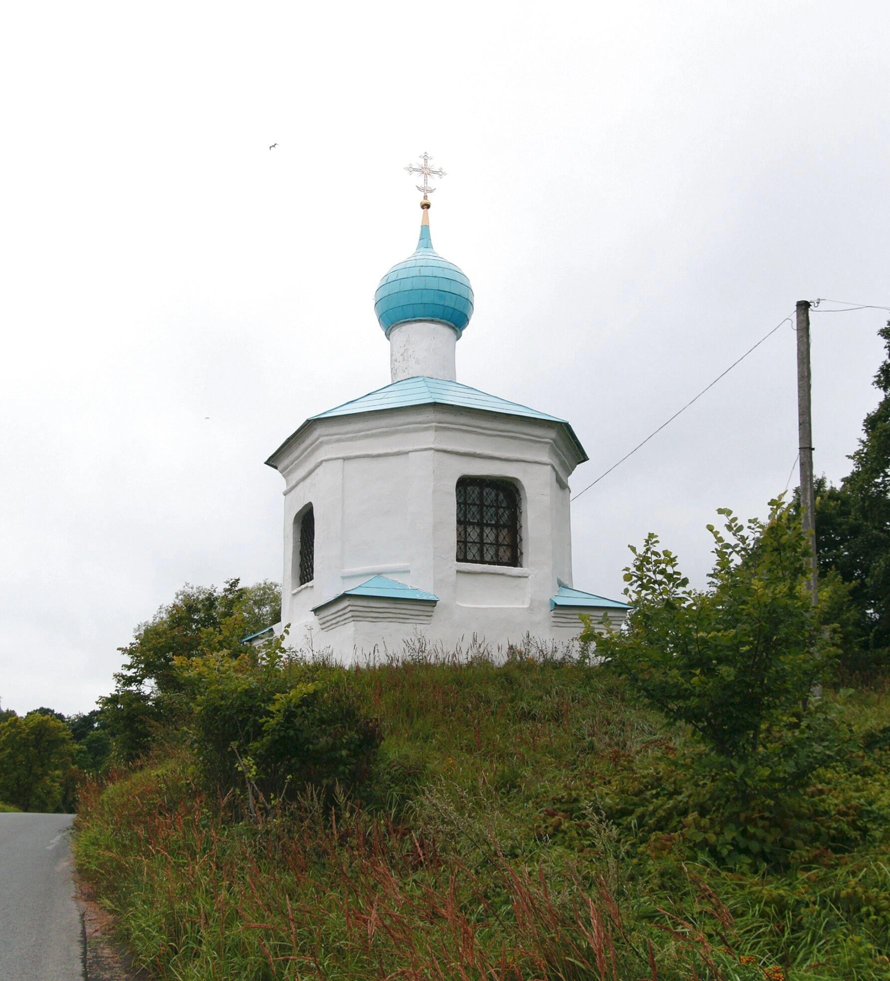 На фотографии запечатлена часовня во имя Четырех Святителей Московских, принадлежащая Снетогорскому монастырю и расположенная на особой возвышенности, исторически именуемой Святая горка. Эта намоленная обитель находится на окраине древнего Пскова, на пути к монастырскому комплексу. Белоснежное восьмигранное здание часовни, увенчанное лазурным куполом и сияющим золотым крестом, является характерным образцом православной архитектуры Псковской земли.
