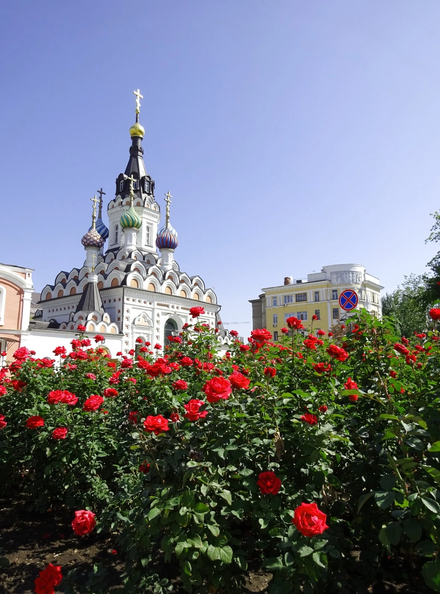 На фотографии запечатлена часовня, принадлежащая храму в честь иконы Божией Матери «Утоли моя печали», что располагается в городе Саратове. Святыня изображена на фоне безоблачного голубого неба, что символизирует чистоту и божественное покровительство. На переднем плане живописно раскинулся цветущий куст алых роз, своими яркими красками подчёркивающий благолепие и духовную радость, исходящую от этого святого места.