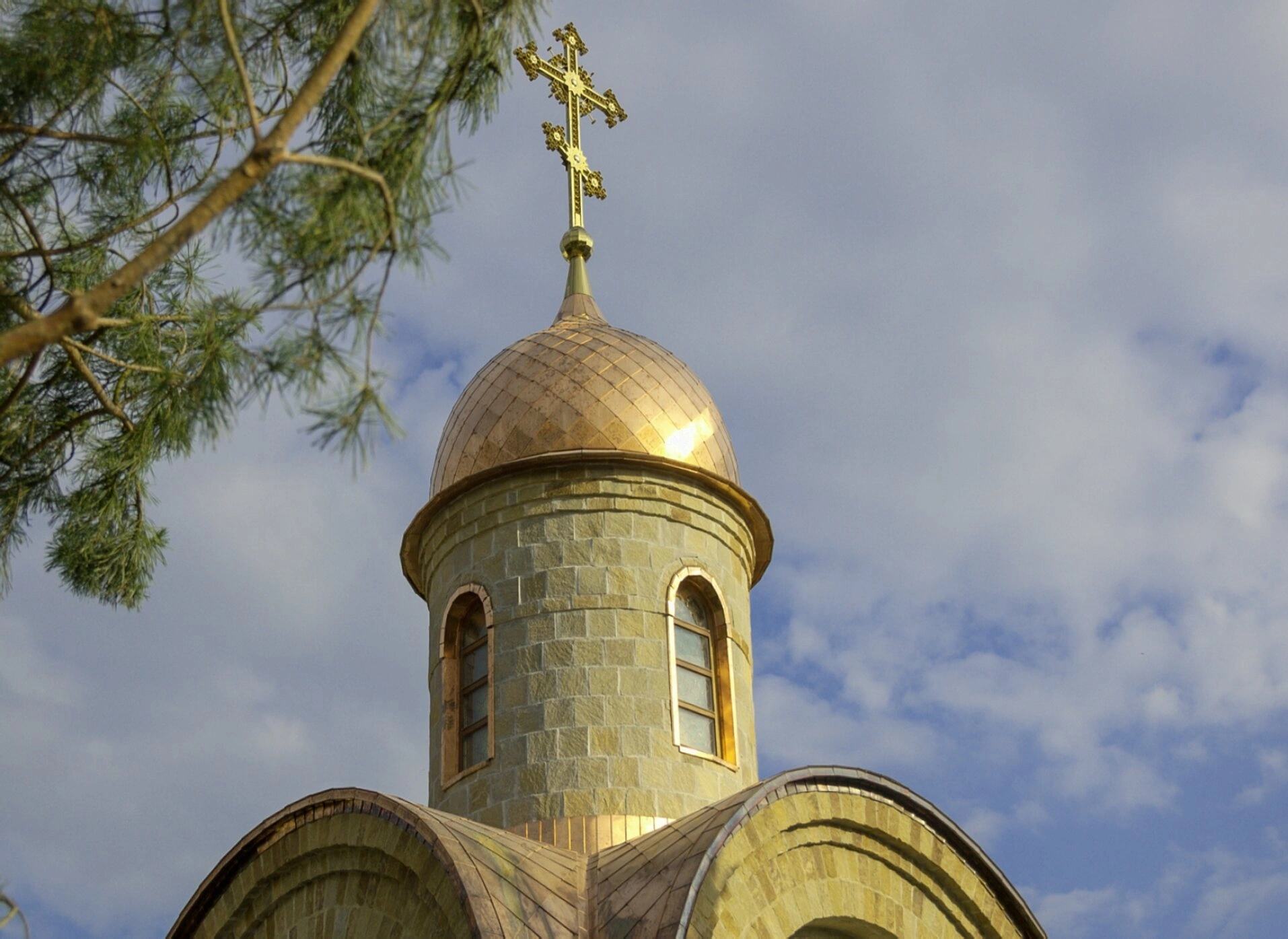 На переднем плане справа от купола виднеются ветви хвойного дерева, что создаёт особую гармонию между творением Божиим и рукотворным храмом. Вечнозелёные хвойные ветви символизируют вечную жизнь, дарованную нам через Воскресение Христово. Небесный фон с легкими облаками дополняет благостное настроение снимка, напоминая о горнем мире, куда устремлены молитвы верующих.