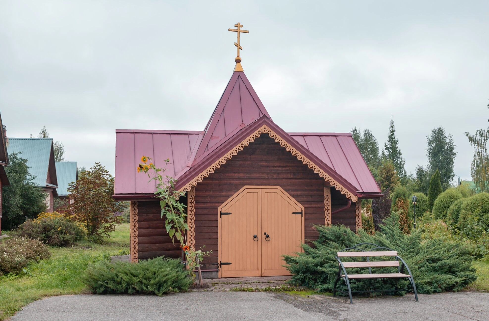 На представленной фотографии запечатлена деревянная часовня в честь иконы Божией Матери «Живоносный Источник», расположенная на территории Александро-Невского женского монастыря в селе Маклаково Талдомского городского округа Московской области. Небольшое аккуратное строение, увенчанное золочёным православным крестом, является ярким образцом традиционного русского храмового зодчества.