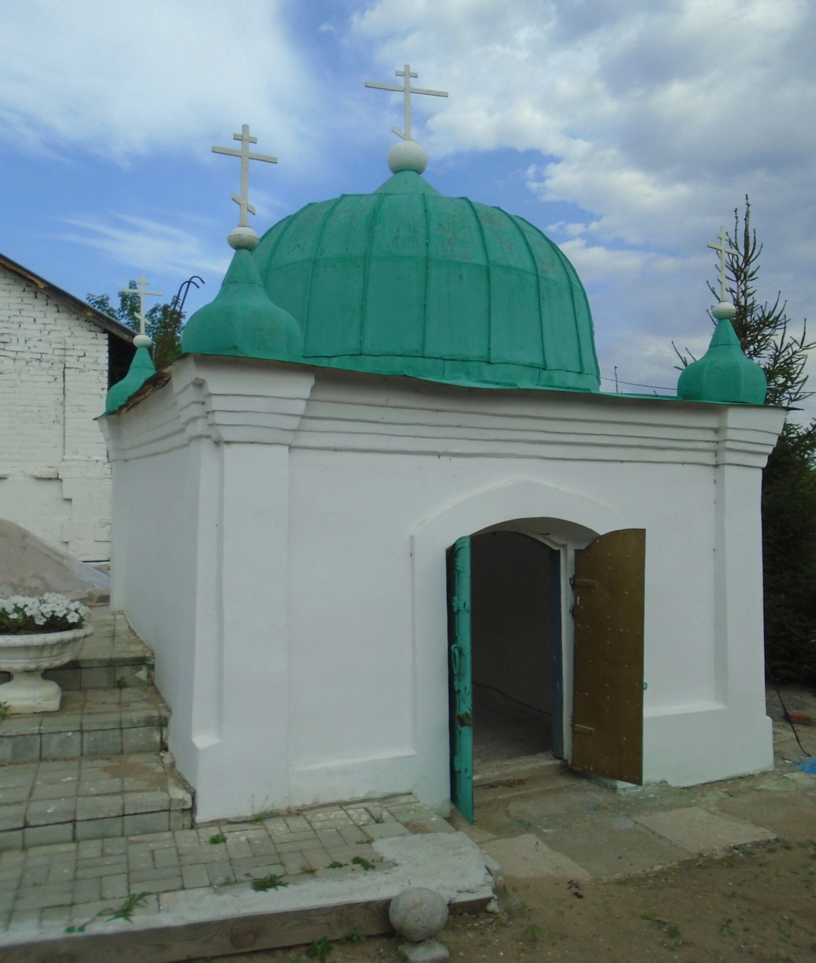 На представленной фотографии запечатлена каменная часовня во имя святого пророка Божия Илии, расположенная в историческом центре города Елабуги. Часовня предстаёт в ясный день: её белоснежные оштукатуренные стены контрастируют с ярко-зелёными куполами, увенчанными православными крестами. Центральный купол, более крупный, возвышается над двумя меньшими боковыми главами, создавая традиционное для русской храмовой архитектуры трёхглавие. Вход оформлен арочным проёмом с открытой деревянной дверью, внутренняя поверхность которой выкрашена в бирюзовый цвет. К входу ведёт небольшая бетонная лестница. Слева от часовни виден фрагмент белого кирпичного здания, а у подножия лестницы установлена большая белая ваза с цветами. Вокруг пролегает грунтовая дорожка, а фон заполняют деревья и кустарники под облачным небом с голубыми просветами.