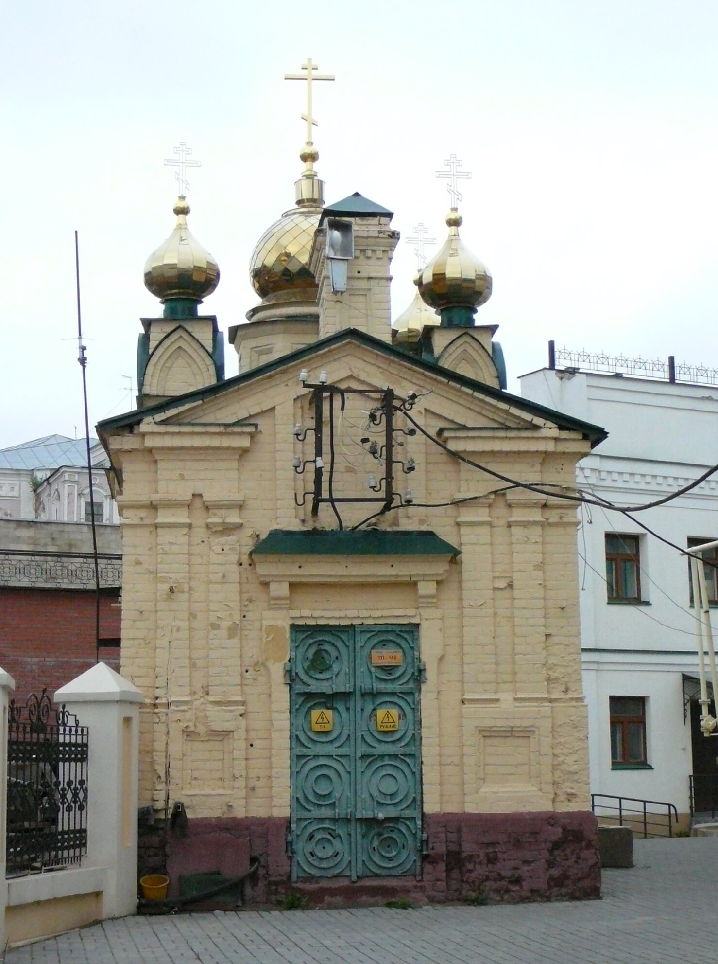 На представленной фотографии запечатлена часовня во имя святого мученика Иоанна Воина, расположенная в историческом центре Казани, в непосредственной близости от Никольского кафедрального собора. Это небольшое, но выразительное церковное строение, являющееся неотъемлемой частью архитектурного ансамбля одной из главных пешеходных артерий города — улицы Баумана.