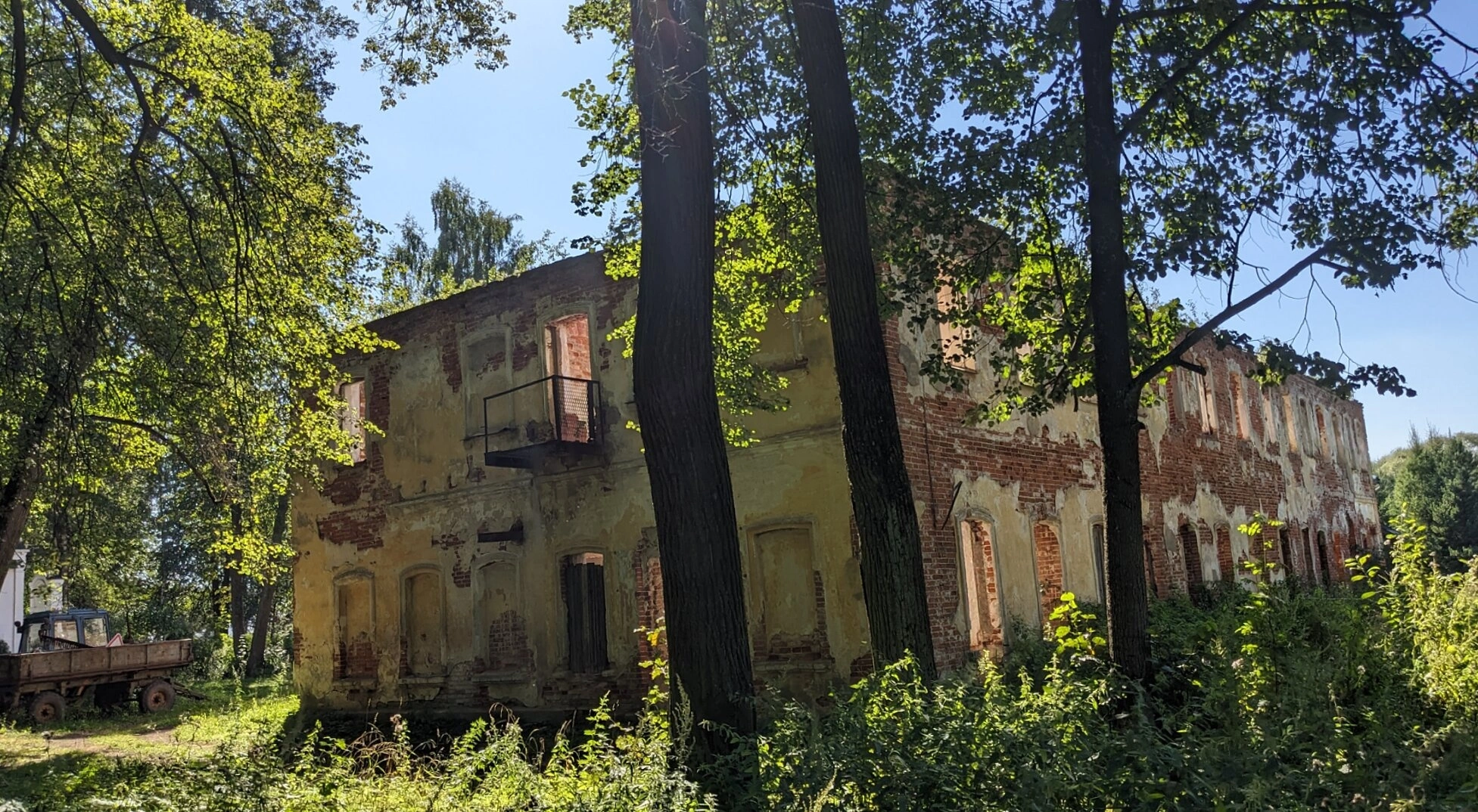 Святыня находится в окружении густой растительности: высокие деревья с пышной кроной и разросшиеся кустарники практически скрывают фундамент здания. Солнечные лучи, пробивающиеся сквозь листву, создают сложную игру света и тени на стенах часовни. На переднем плане видны мощные стволы деревьев, а слева за растительностью угадываются очертания брошенной тележки.