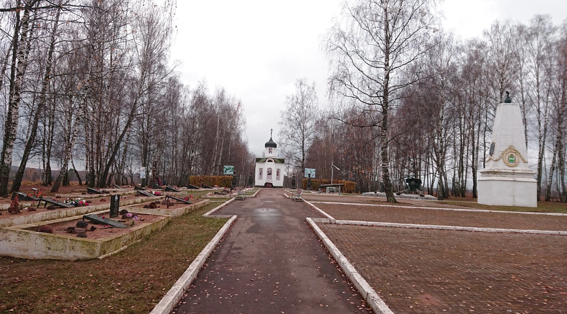 С левой стороны от центральной аллеи расположены ряды воинских захоронений с чёрными надгробиями, где покоятся павшие воины. Вся территория мемориала окружена редкими деревьями с оголёнными ветвями, что свидетельствует о внелиственном периоде года. Пасмурное небо создаёт атмосферу благоговейной тишины и молитвенной сосредоточенности, соответствующую святости данного места.