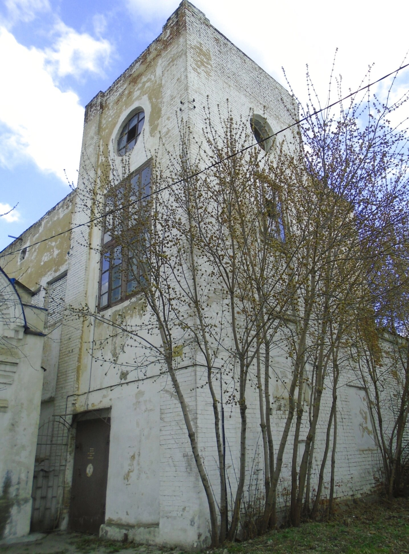 На представленной фотографии запечатлена старинная православная часовня, расположенная на улице Цеткин в Казани. Снимок, сделанный 29 апреля 2021 года, показывает ветхое, но всё ещё величественное здание из белого кирпича. Его башнеобразная часть украшена крупными прямоугольными окнами и двумя симметрично расположенными круглыми окнами в верхней части. Вокруг строения видны голые ветви деревьев и сухая трава, что указывает на раннюю весну, а на заднем плане простирается чистое голубое небо.