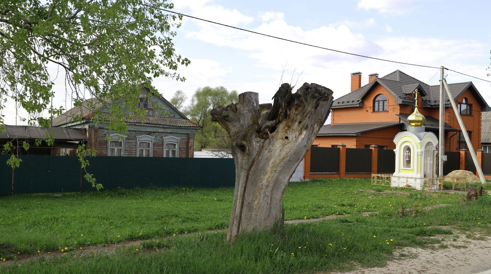 Зелёный травяной покров вокруг часовни и сохранившийся пень на переднем плане создают естественное природное обрамление, подчеркивая гармонию между творением Божиим и человеческим мастерством. Часовня Казанской иконы Божией Матери в Бывалино является не только архитектурным памятником, но и действующим духовным центром, сохраняющим православные традиции Подмосковья.