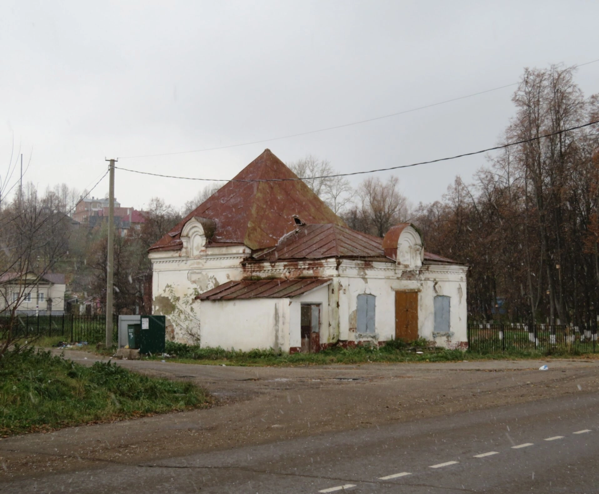 В годы богоборчества святыня, лишённая своего предназначения, была осквернена: помещение использовалось под аптеку, торговую лавку и кулинарию, а глава, венчавшая здание, была утрачена. Ныне часовня, утратившая свой первоначальный облик, пребывает в недействующем состоянии и требует благочестивых трудов по своей реставрации и восстановлению. На фотографии запечатлён её нынешний вид: белые стены, сложенная из металла кровля необычной формы, а вокруг — деревья, дорога и лёгкий снежный покров, подчёркивающие тихую, скорбную красоту этого забытого священного места. На снимке нет людей, крупным планом изображено исключительно архитектурное сооружение.