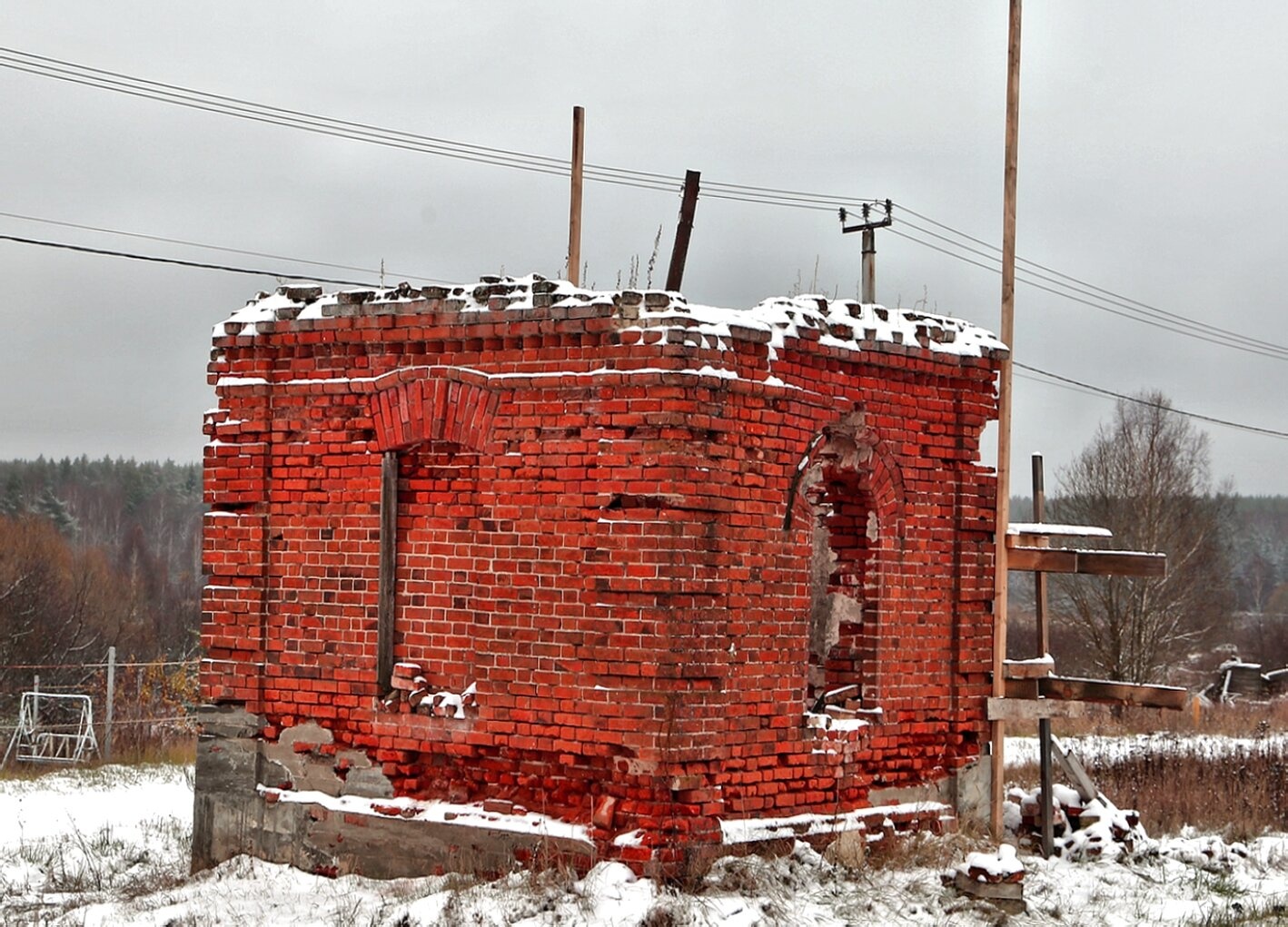 На представленной фотографии запечатлена полуразрушенная кирпичная часовня, расположенная на территории бывшего Архангельского Погоста в деревне Трусково Киржачского района Владимирской области. Святыня находится в плачевном состоянии: полностью утрачена кровля и значительная часть верхних стен, что обнажает внутреннее пространство постройки.