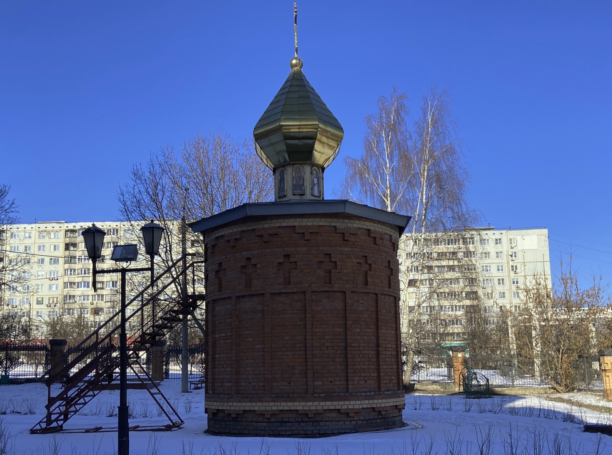 Снимок сделан в зимний период, о чём свидетельствует снежный покров и деревья с оголёнными ветвями, окружающие святыню. Чистое голубое небо наполняет пространство светом, а фонари, виднеющиеся слева, и лестница предполагают благоустроенность территории для паломников. На заднем плане видны современные жилые дома, что подчёркивает нахождение святого места в городской черте, в непосредственной близости от людей.