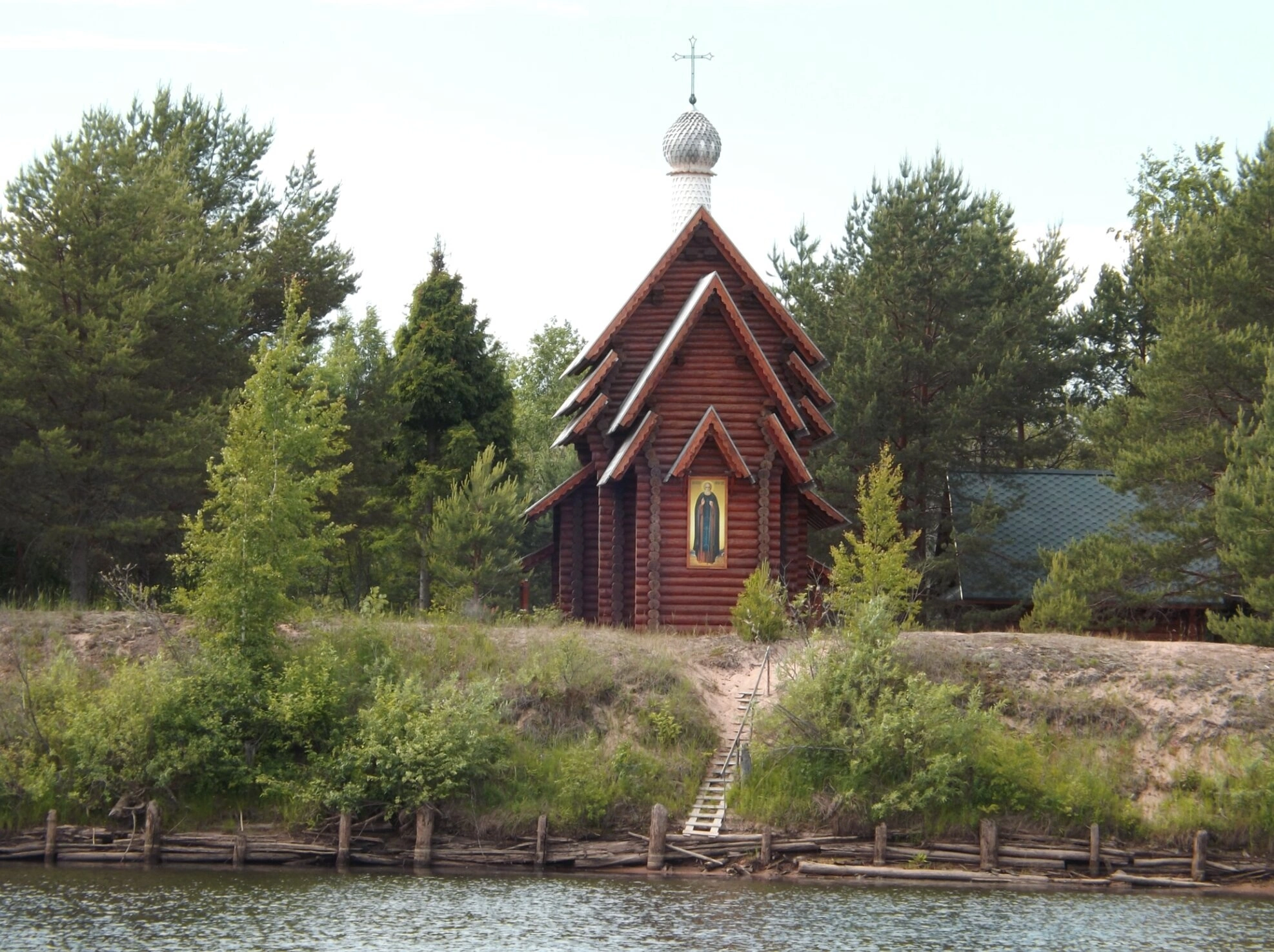 На фотографии запечатлена деревянная часовня, расположенная на живописном берегу реки Оять в Ленинградской области. Эта малая архитектурная форма принадлежит Введено-Оятскому женскому монастырю, одному из древнейших на северо-западе России. Часовня возведена в традициях русского деревянного зодчества и гармонично вписана в природный ландшафт, окружена вековыми соснами.