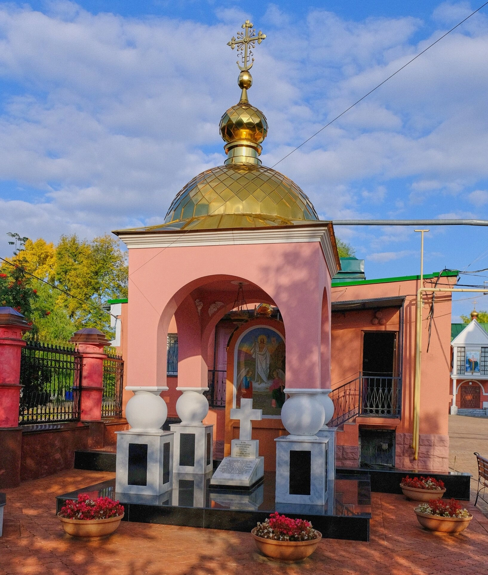 На фотографии запечатлена часовня, находящаяся в пределах соборной территории Свято-Троицкого храма в городе Ижевске. Это малое архитектурное сооружение, выполненное в традициях русского православного зодчества, служит для совершения молитв и кратких богослужений. Часовня увенчана золочёным куполом, на котором воздвигнут святой православный крест, символизирующий победу жизни над смертью. Стены её имеют тёплый розовый оттенок и украшены арочными проёмами, что придаёт всей постройке лёгкость и изящество.