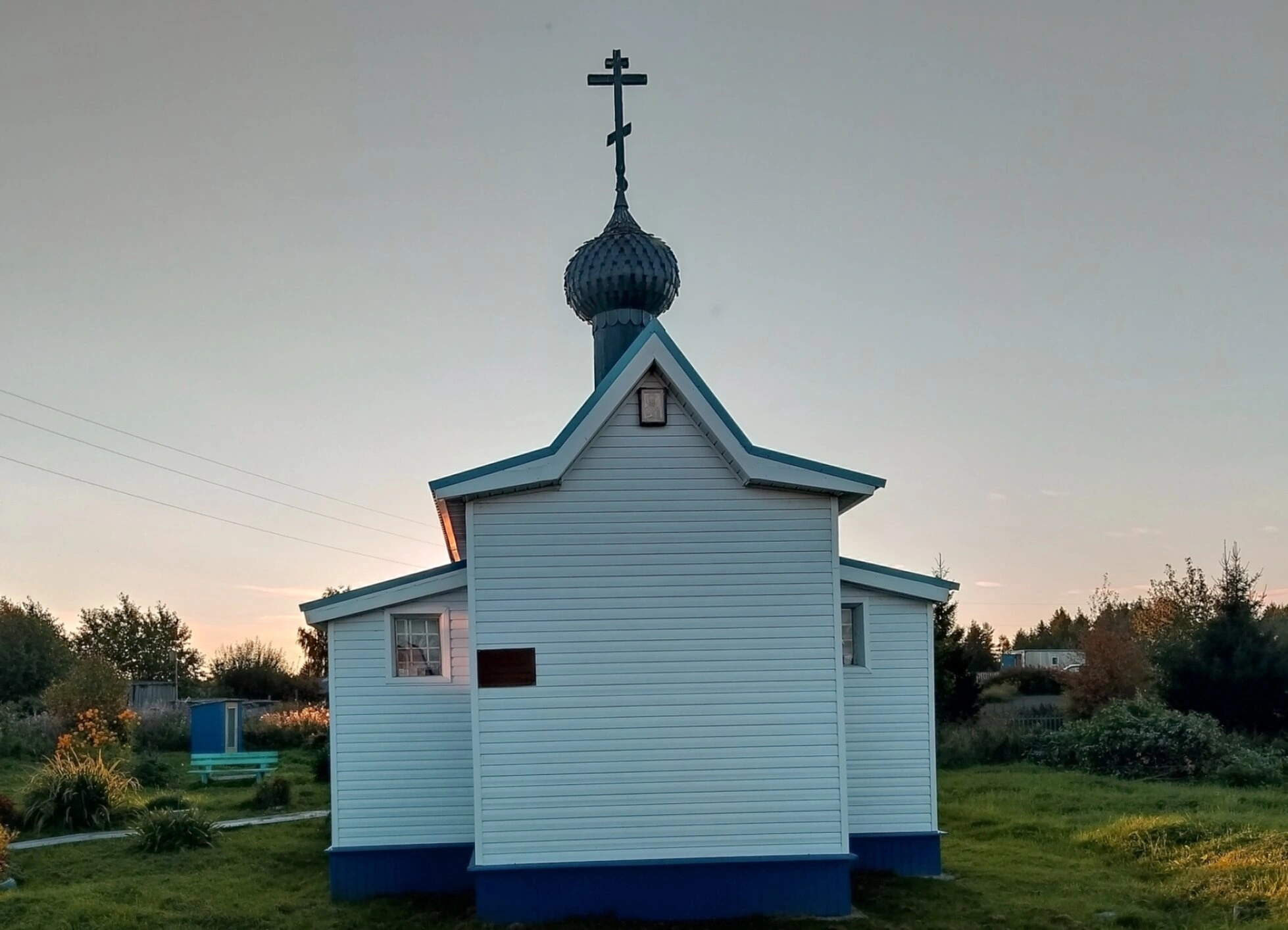 Часовня представляет собой компактное одноглавое строение, обшитое белым сайдингом, что характерно для местных традиций отделки культовых построек. Фундамент сооружения окрашен в глубокий синий цвет, создающий гармоничный контраст с белоснежными стенами. Венчает кровлю изящный синий купол-луковица, увенчанный православным восьмиконечным крестом, ориентированным на восток.