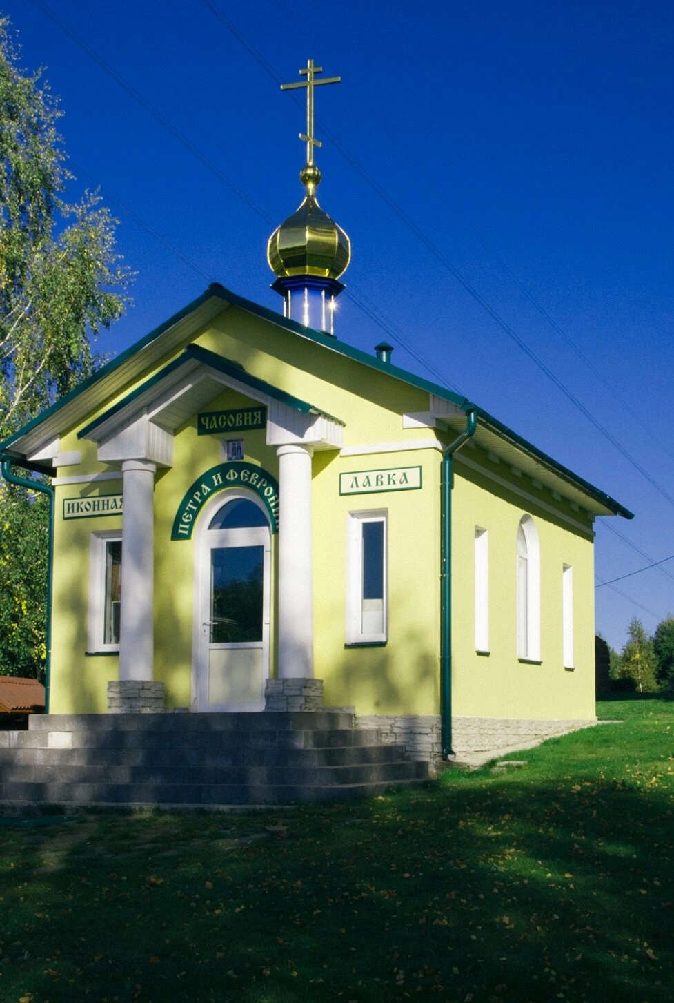 На фасаде сооружения четко просматривается надпись "ЧАСОВНЯ ПЕТРА И ФЕВРО", свидетельствующая о посвящении этого малого храма прославленным русским святым - покровителям семьи и брака. Согласно православной традиции, такие часовни возводятся для совершения молитв и треб, не требующих присутствия священника.