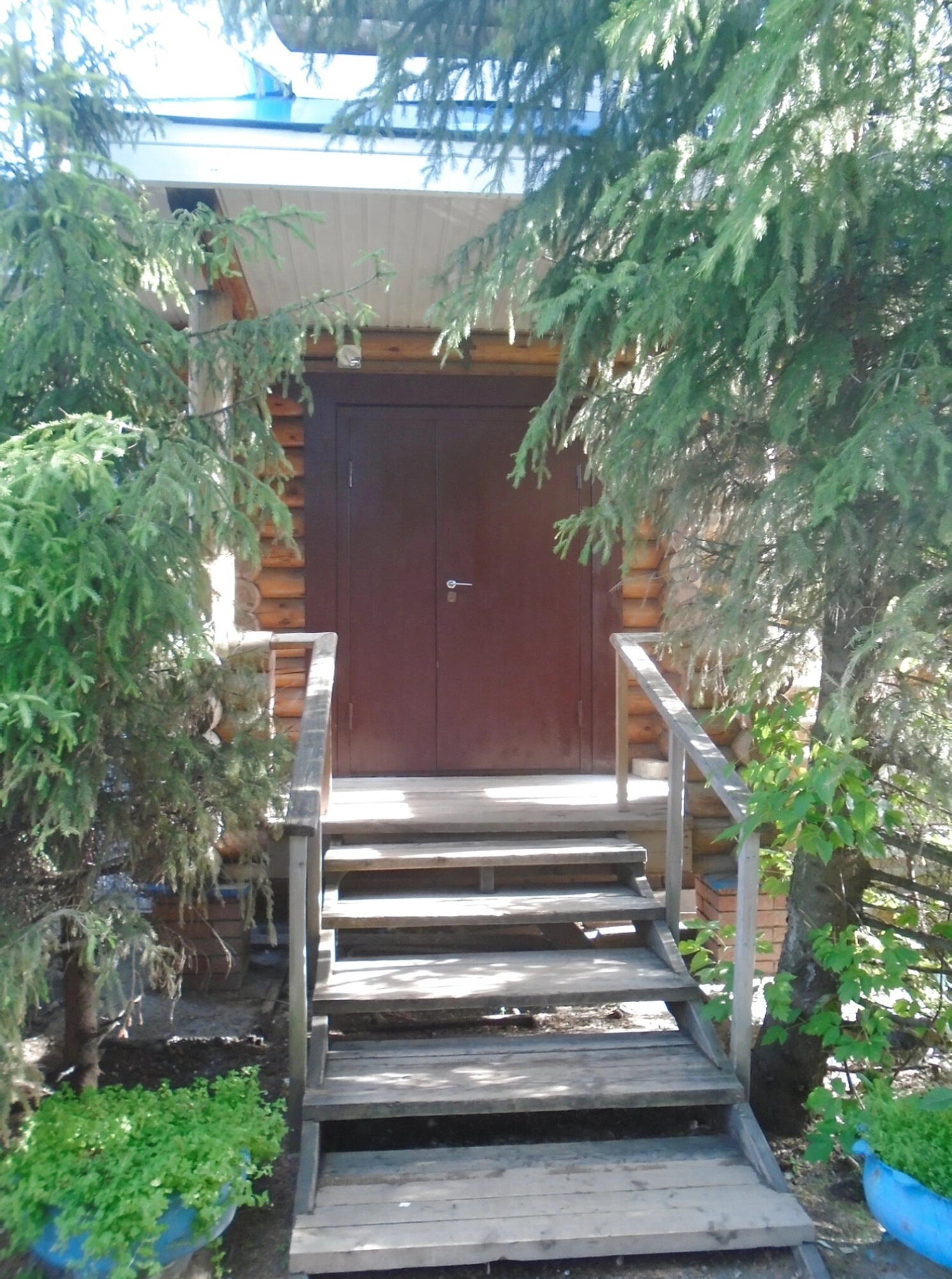 На представленной фотографии запечатлён вход в деревянную часовню, освящённую в честь святых первоверховных апостолов Петра и Павла. Снимок показывает главный подход к святому месту: массивные деревянные ступени с перилами по обеим сторонам ведут к двустворчатой коричневой двери. Ступени и ограждения имеют естественный, немного выветренный вид, что свидетельствует о длительном использовании. По бокам от лестницы размещены синие горшки с низкорослыми зелёными растениями, а вокруг произрастают хвойные деревья, создающие ощущение уединённости и покоя.