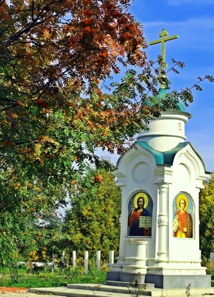 Божий мир окружает эту малую церковь, подчёркивая её красоту. Слева от входа раскинула свои ветви рябина, осенью украшенная алыми гроздьями ягод, которые в народной традиции символизируют светлую жертву и чистоту. Хвойные деревья и кустарники обрамляют часовню, создавая ощущение уединённости и покоя. На заднем плане видны другие деревья в золотом осеннем убранстве, а над ними простирается чистое голубое небо — символ небесной чистоты и вечности.