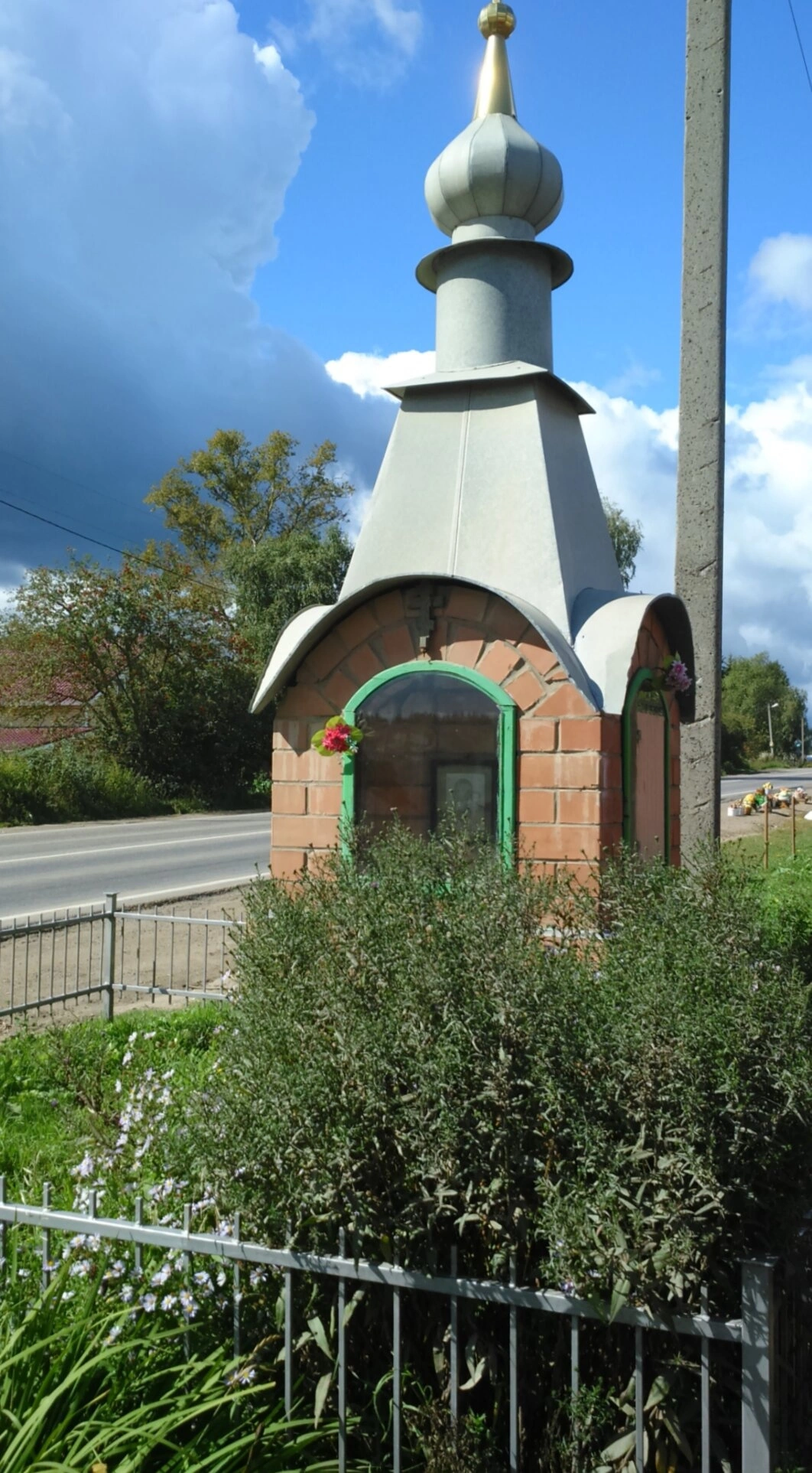 На представленной фотографии запечатлена часовня-поклонный крест, относящаяся к приходу Церкви святого пророка Божия Илии в деревне Григорово Александровского района Владимирской области. Данное молитвенное сооружение представляет собой кирпичную часовню, увенчанную многоярусной кровлей и куполом с православным крестом, символизирующим искупительную жертву Господа нашего Иисуса Христа.