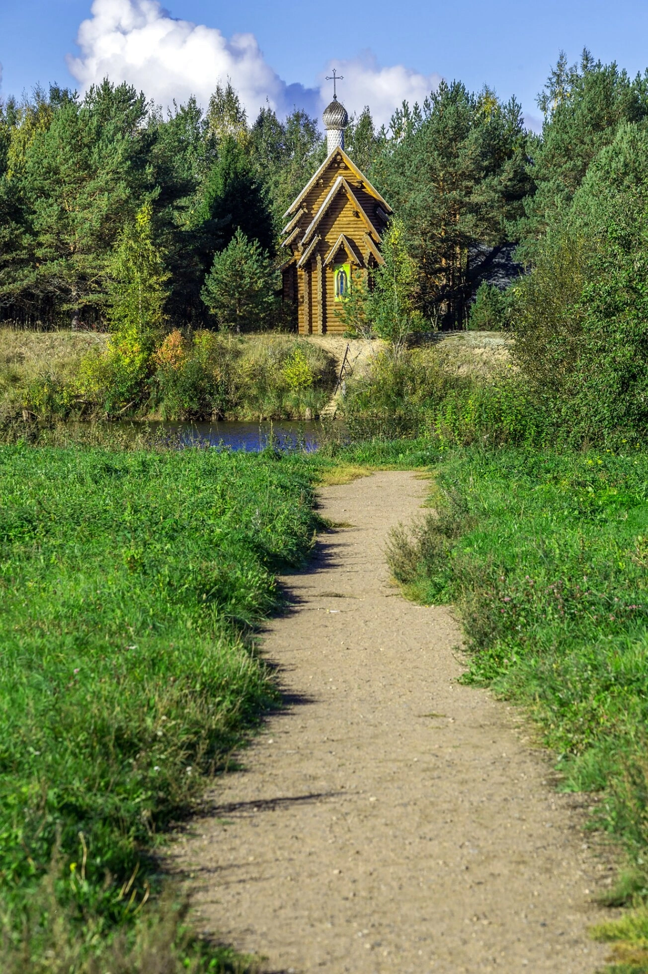 На фотографии запечатлена часовня, посвящённая преподобному Александру Свирскому, расположенная в живописном месте на берегу реки Оять в Ленинградской области. Эта святая обитель находится вблизи Введено-Оятского женского монастыря, основанного в XIV веке и являющегося одной из значимых православных святынь русского Севера. Часовня гармонично вписана в природный ландшафт, окружена лесными массивами и водами реки Оять, создающими атмосферу благодати и умиротворения.