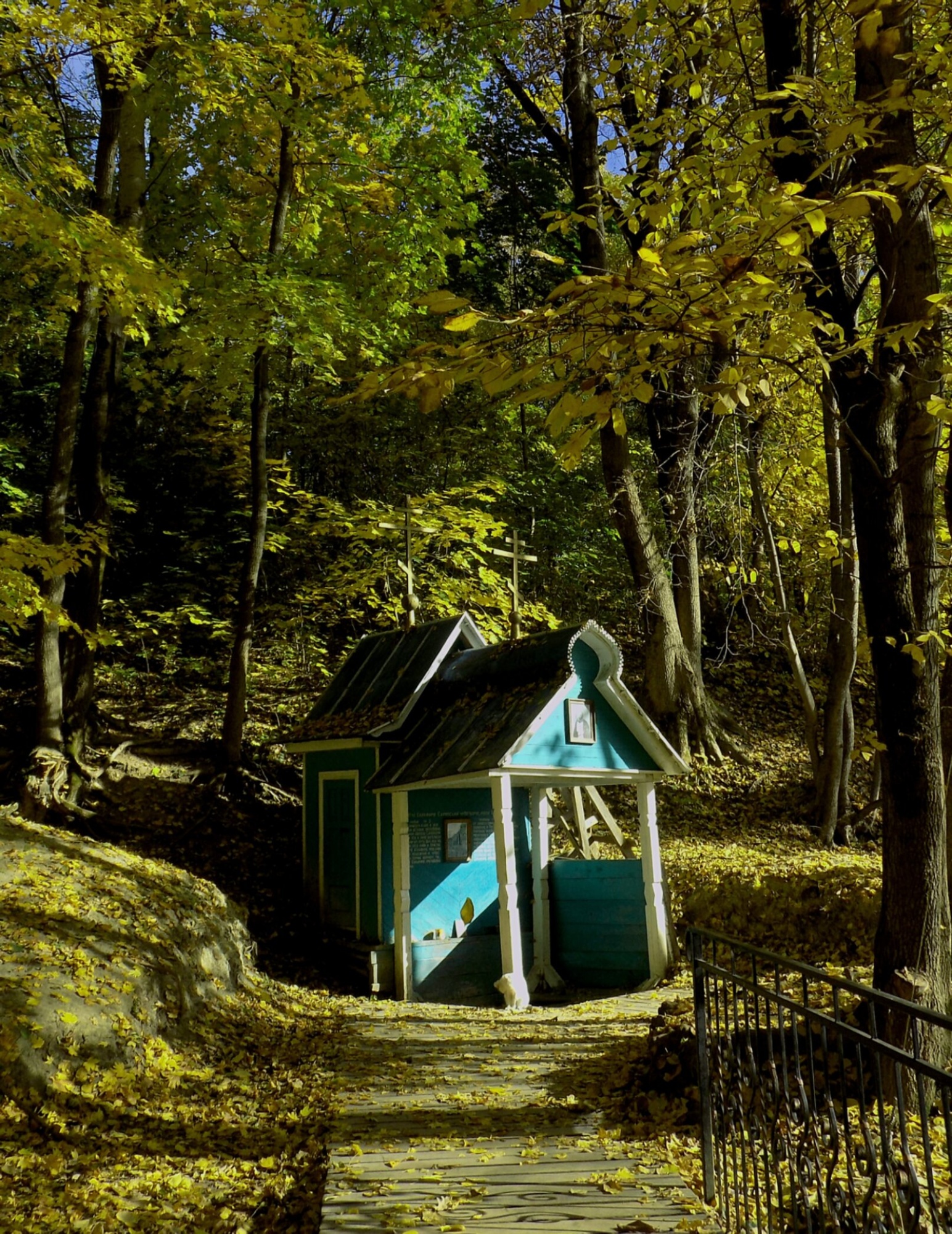 Снимок сделан в осеннюю пору, когда окружающий часовню лес преображается, одеваясь в золотые и багряные одежды. Ковёр из опавших листьев покрывает землю и тропинку, ведущую к святыне, создавая атмосферу тишины, покоя и благочестивого размышления о вечном. Справа от тропы видна часть металлического ограждения, что указывает на благоустроенность территории обители для паломников.