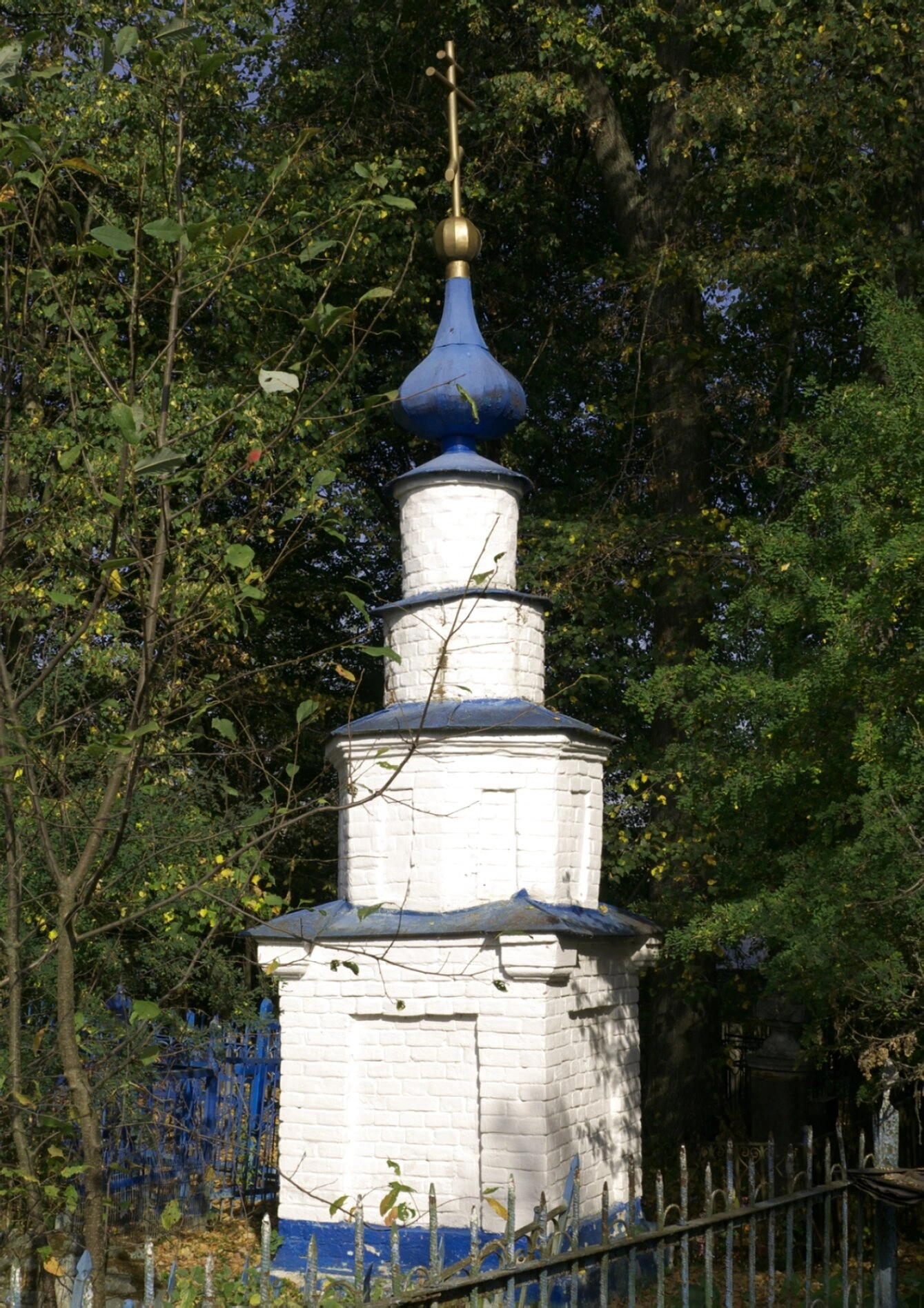 На фотографии просматриваются следы времени на фасаде здания: местами облупившаяся краска и потемнения на кровле свидетельствуют о почтенном возрасте постройки. Часовня обнесена старым металлическим забором синего цвета, за которым виднеются деревья с осенней листвой, что позволяет определить время съемки как осенний период.