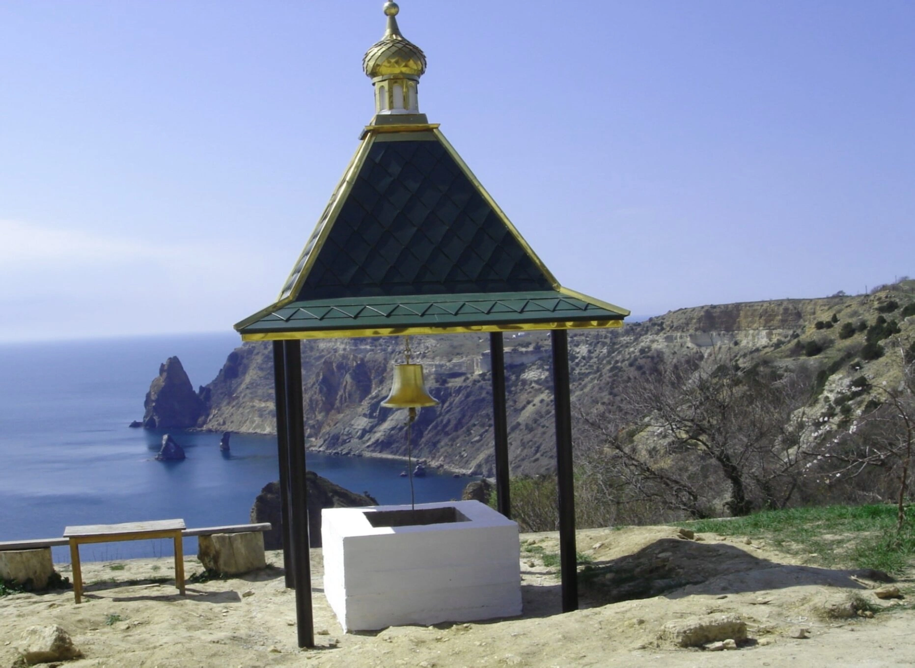 На представленной фотографии запечатлена малая часовня, расположенная на территории древнего Свято-Георгиевского монастыря, что на мысе Фиолент в Крыму. В центре композиции — сама часовня-звонница, увенчанная золочёной главкой и подкрестным яблоком, символизирующим свет Христовой истины. Под сенью её кровли, покрытой медными листами, что обрели благородный зелёный оттенок от времени и морского воздуха, подвешен колокол для созыва братии и богомольцев на молитву.