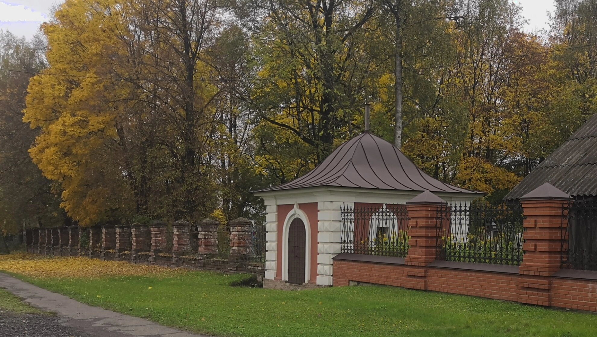 На заднем плане фотографии видны деревья с осенней листвой жёлтого и зелёного цвета, создающие живописное обрамление для святого места. Осеннее убранство природы подчёркивает умиротворённость и духовную значимость этого уголка православной России. Часовня-сень над источником святителя Николая Чудотворца является не только архитектурным памятником, но и действующим местом молитвы и поклонения для православных христиан.