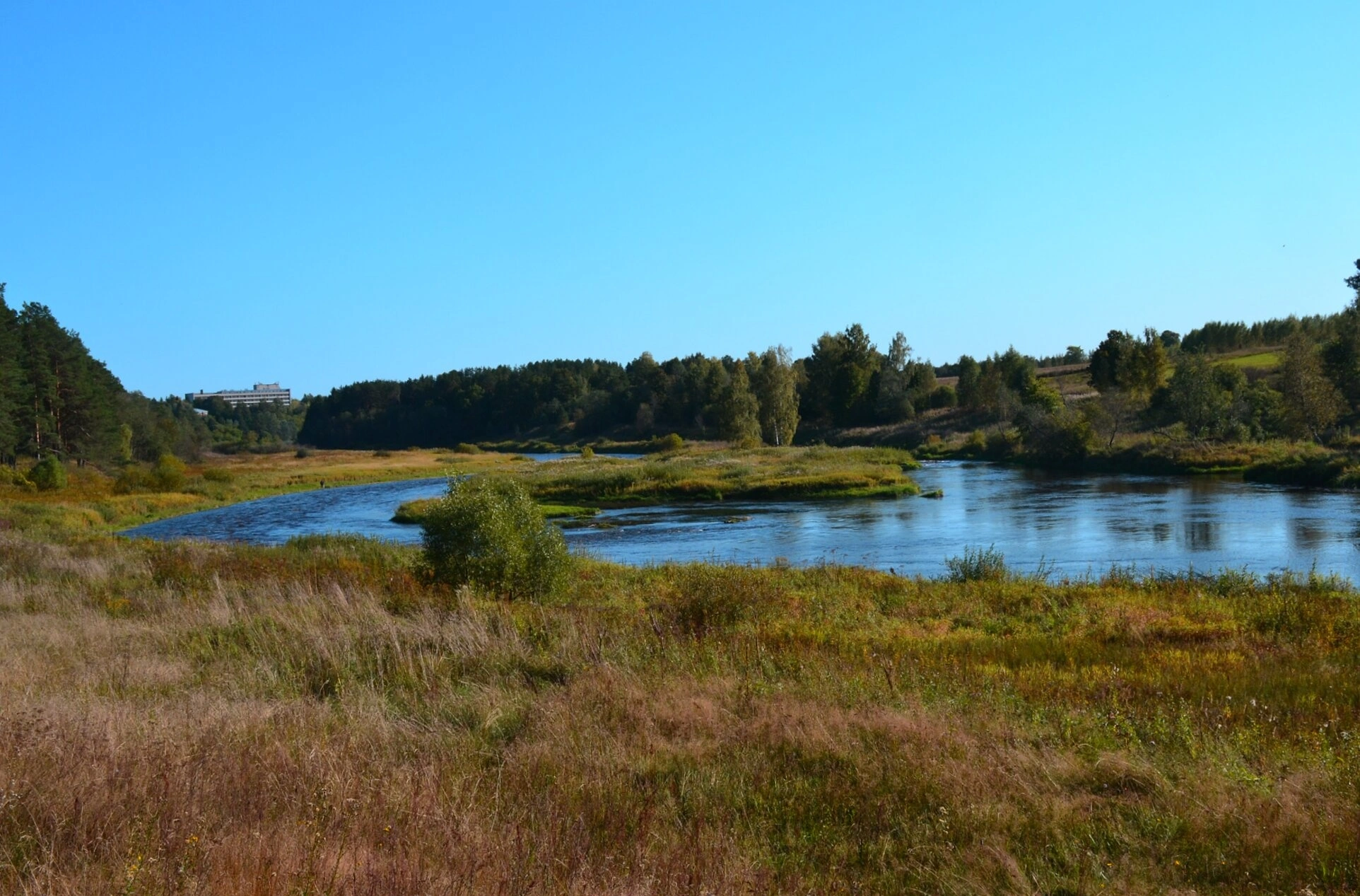 Вдали на противоположном берегу просматривается крупное здание, возможно, связанное с историческими гидротехническими сооружениями камерного шлюза Вышневолоцкой водной системы. Этот архитектурный ансамбль является объектом культурного наследия Торжокского района и свидетельствует о богатой истории данного края.