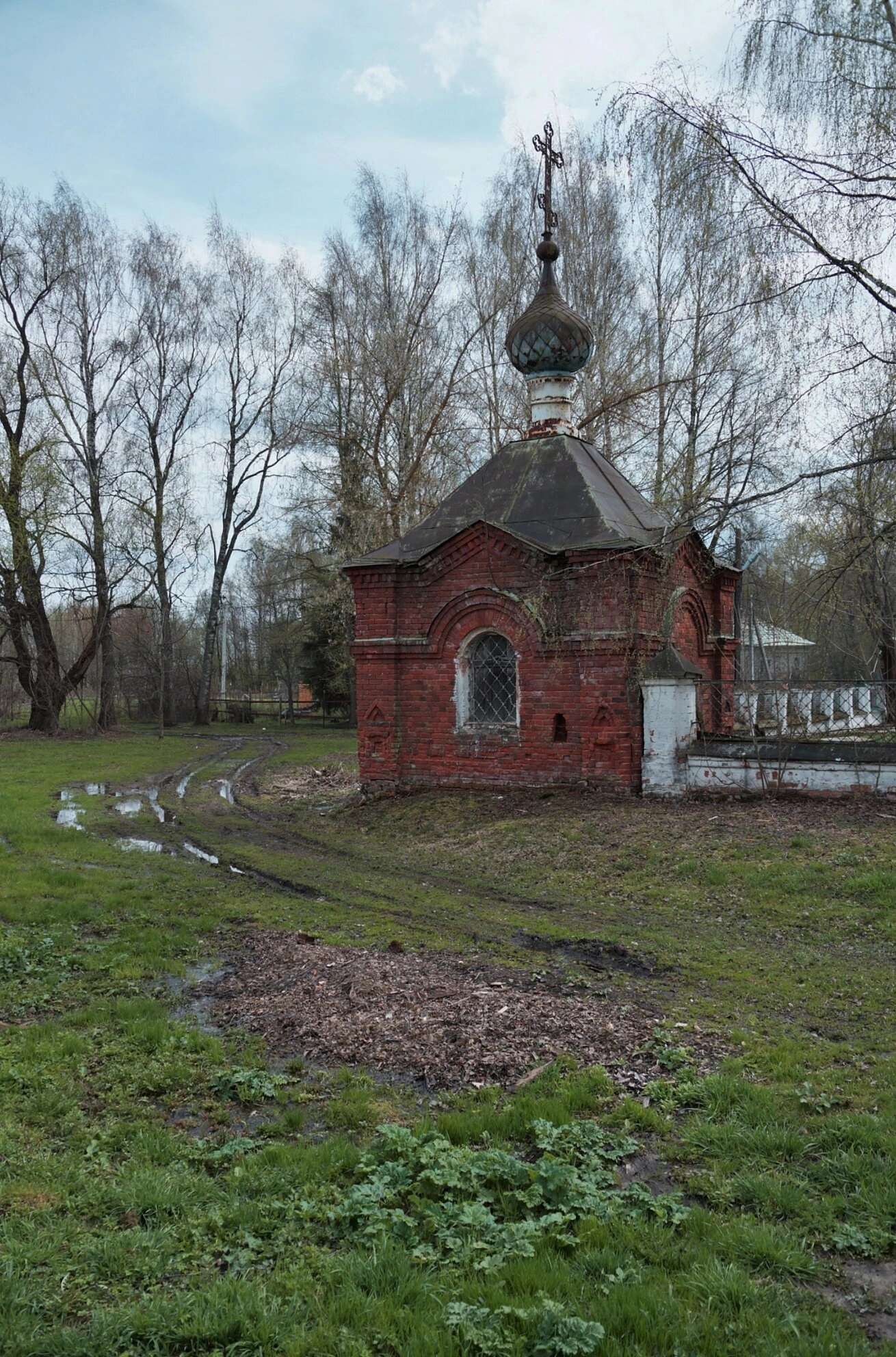 Несмотря на плачевное состояние, архитектурные формы часовни сохраняют черты традиционного русского церковного зодчества. Дорога к святому месту размыта, что указывает на недостаточное содержание и сезонные погодные условия, характерные для ярославской земли.