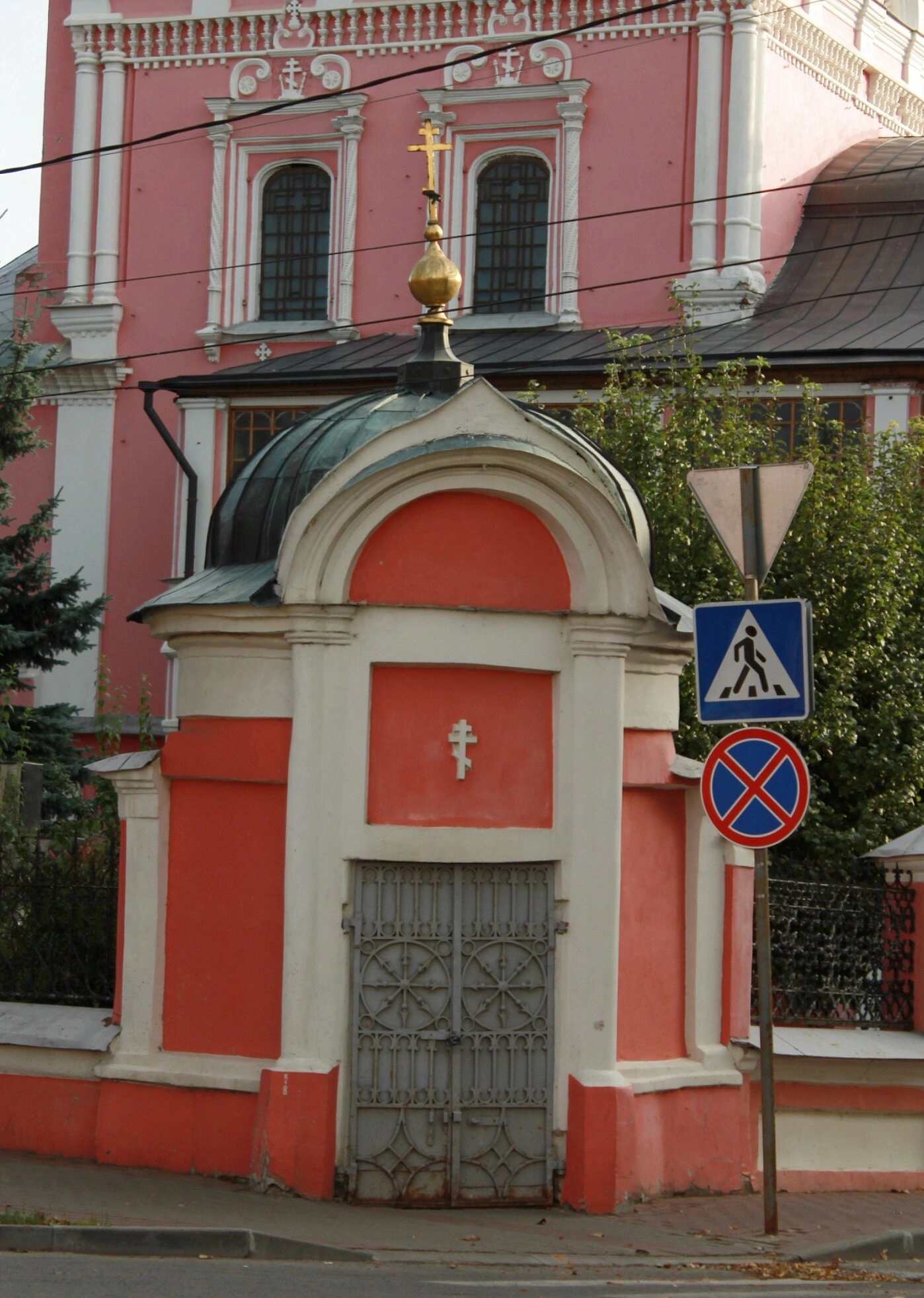 На переднем плане фотографии видны современные элементы городской инфраструктуры, включая дорожные знаки «Пешеходный переход» и «Остановка запрещена», что подчеркивает гармоничное сочетание исторического наследия и современной городской среды. Часовня сохраняет свое сакральное значение и является местом молитвы для православных верующих, продолжая многовековую духовную традицию калужской земли.