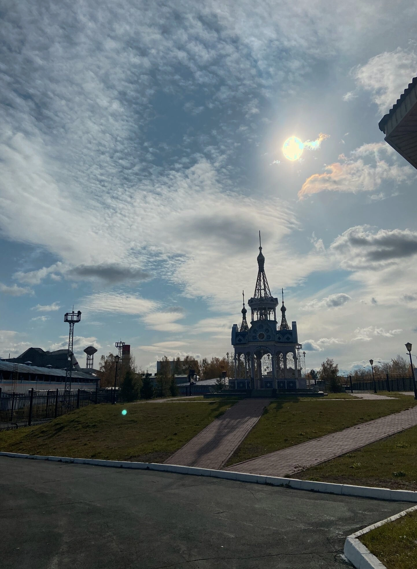 На переднем плане фотографии видна аккуратно вымощенная каменная дорожка, ведущая к входу в часовню. Территория вокруг святыни благоустроена: ухоженный зелёный газон и молодые деревья создают гармоничное обрамление для церковного сооружения. Небесный свод с легкими облаками и солнечными лучами, мягко освещающими часовню, добавляет снимку особой благодатной атмосферы.