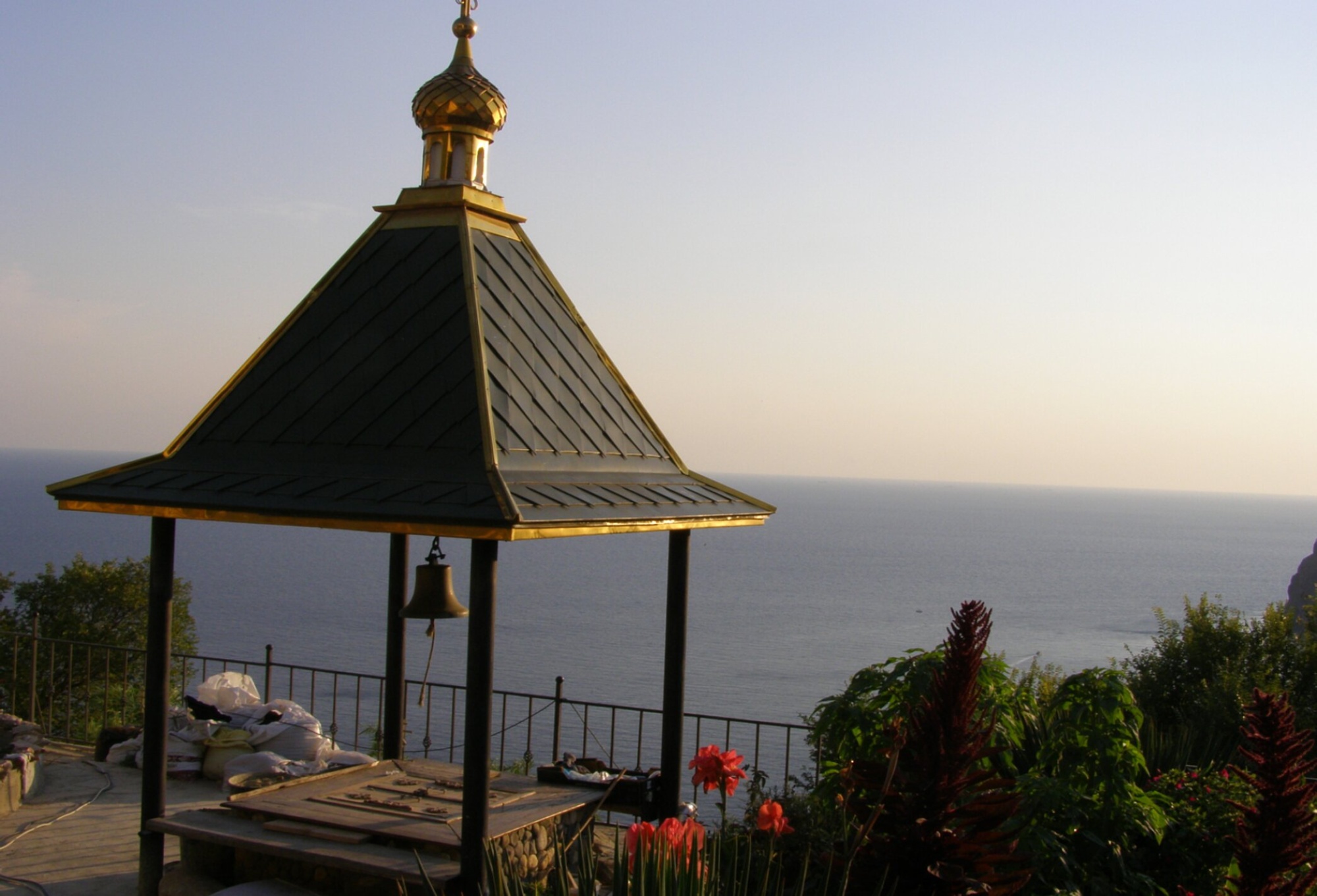 На фотографии запечатлена одна из малых архитектурных форм Свято-Георгиевского монастыря, что располагается на древнем мысе Фиолент близ Балаклавы. Изображённая часовня-беседка, увенчанная золочёной главкой и колоколом, стоит на краю скалистого обрыва, открывая благодатный вид на бескрайние морские просторы Чёрного моря.