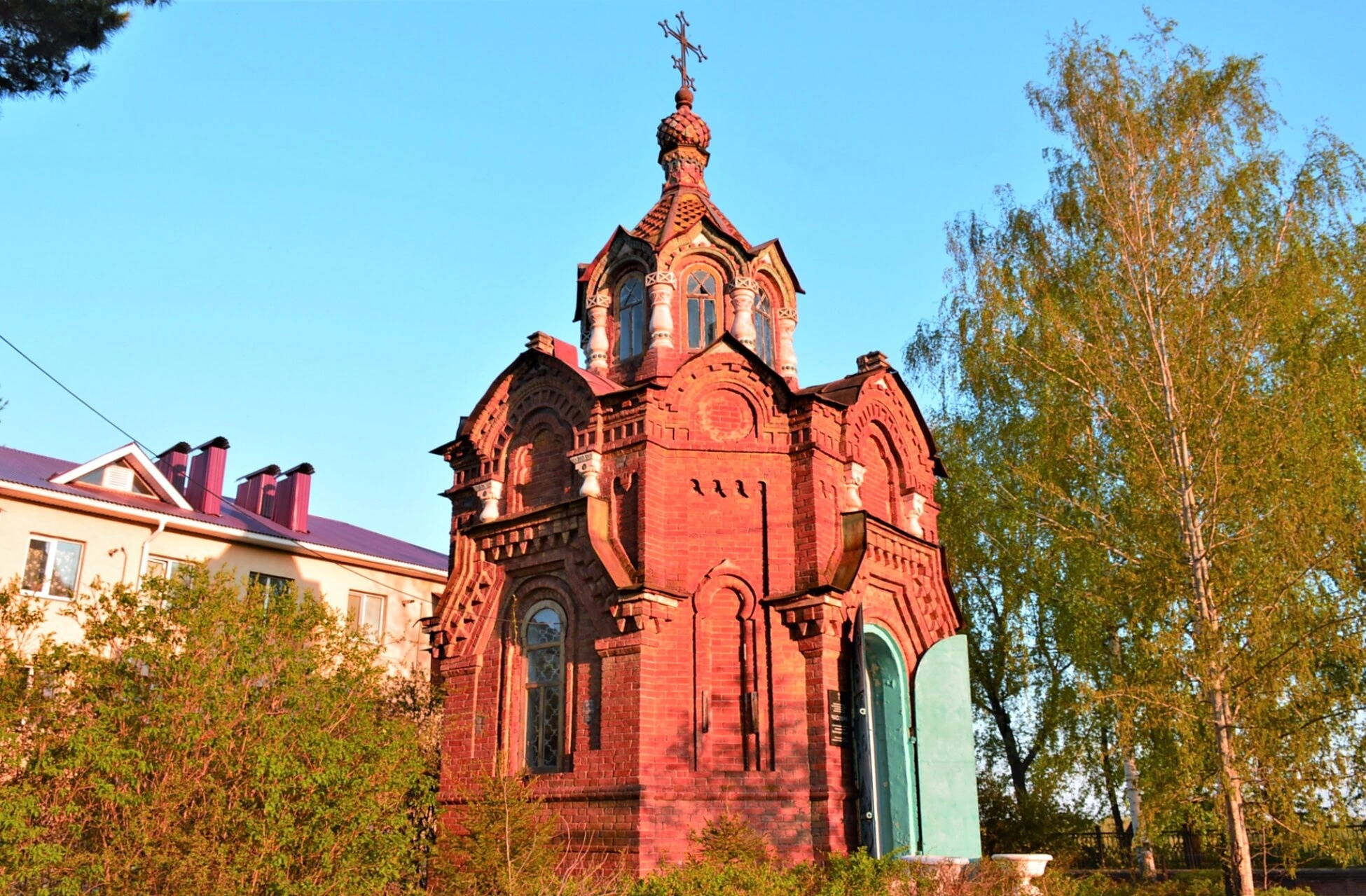 Часовня стоит в окружении густой зелени — кустарников и высоких деревьев, что создаёт ощущение уединённости и покоя. Слева на заднем плане виден фрагмент другого здания с красной крышей — это Спасский собор, рядом с которым расположена часовня.
