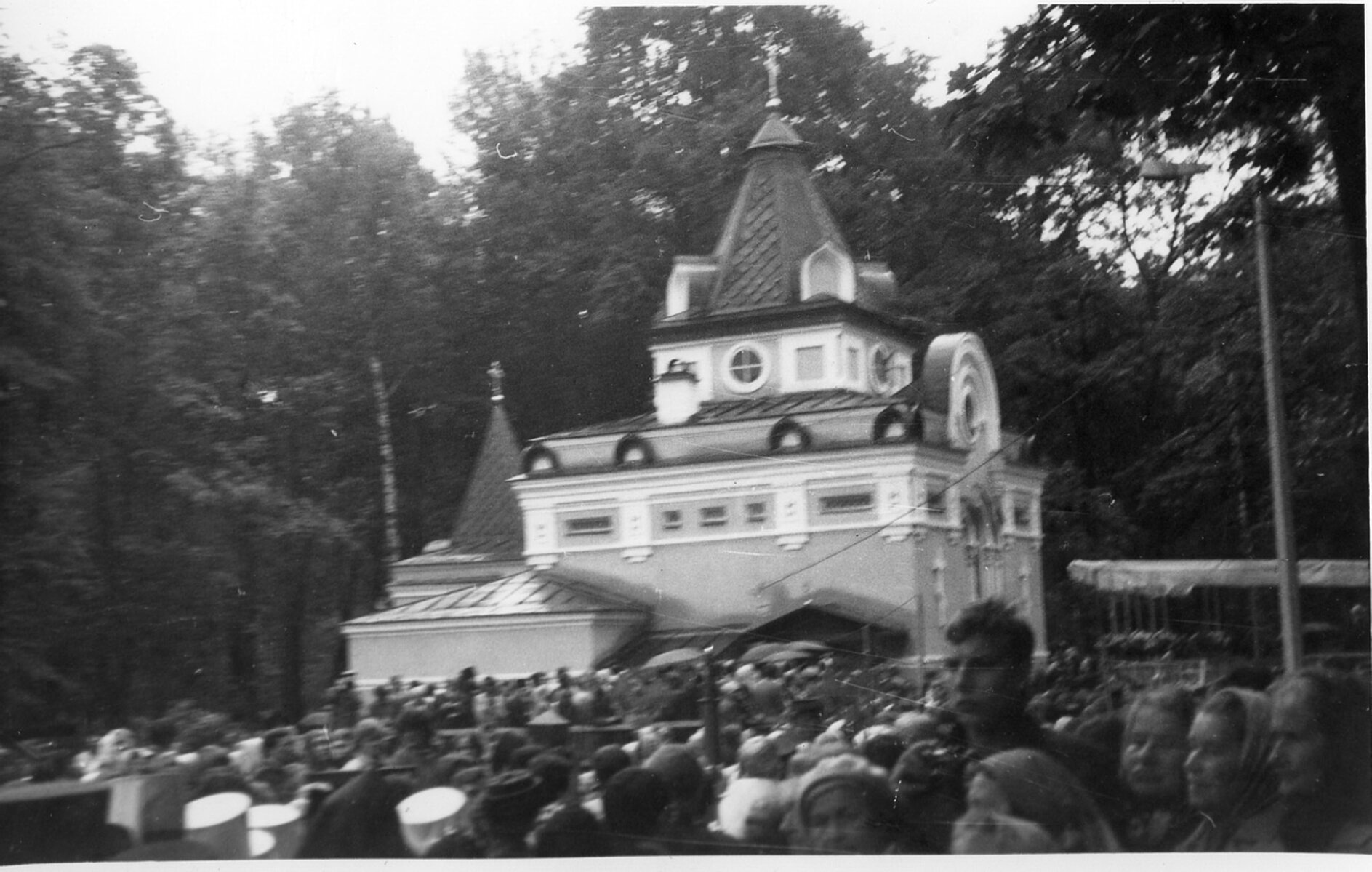 На переднем плане фотографии собралась многочисленная группа верующих, прибывших поклониться святой угоднице. Люди облачены в тёмную одежду, что соответствует традициям благочестия при посещении кладбищенских храмов и часовен. В их позах и расположении угадывается благоговейное ожидание возможности приложиться к святыне.