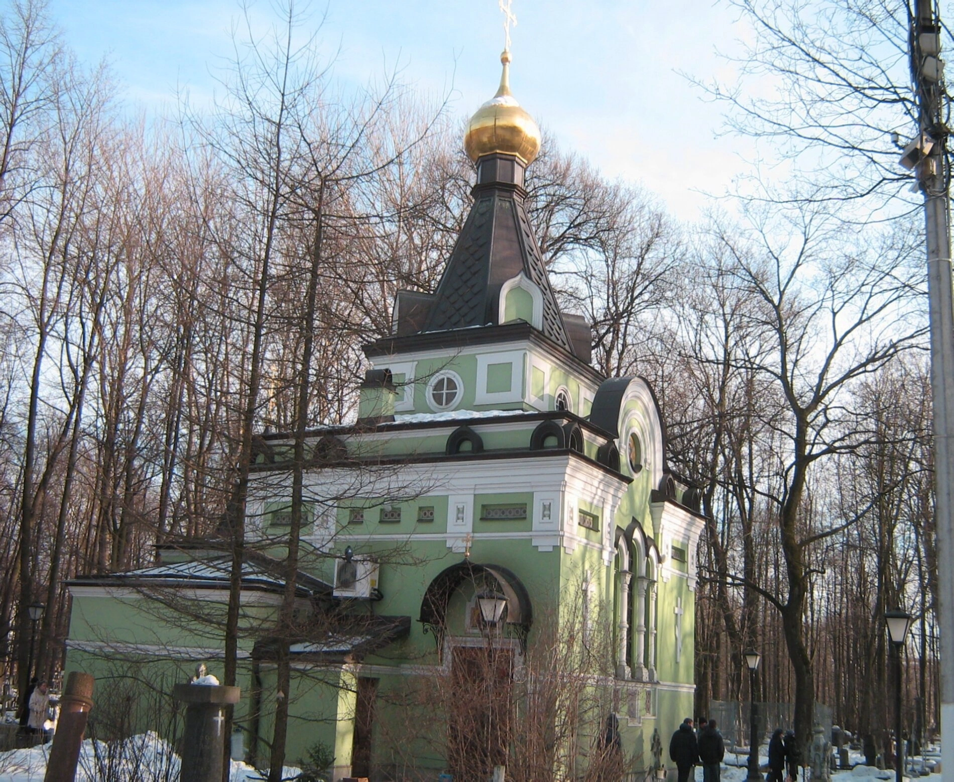 На представленной фотографии запечатлена часовня во имя святой блаженной Ксении Петербургской, расположенная на Смоленском православном кладбище в граде Санкт-Петербурге. Это намоленное место является одной из наиболее почитаемых святынь северной столицы, куда ежедневно приходят сотни верующих для молитвенного обращения к угоднице Божией.