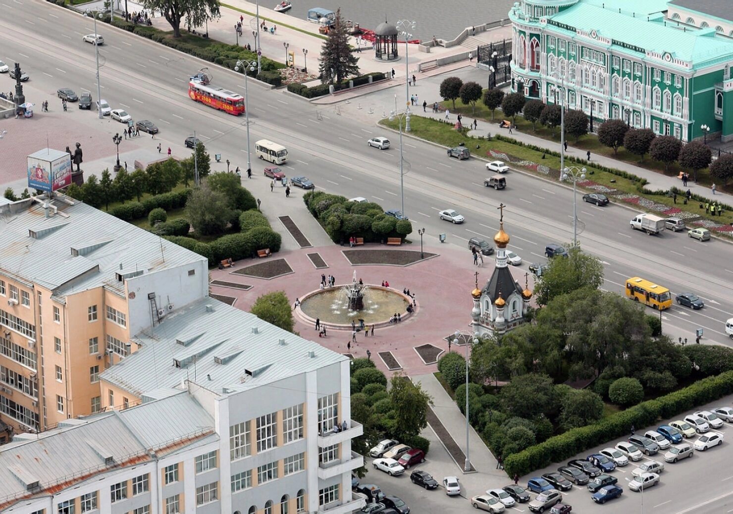 На представленной фотографии запечатлен вид сверху на Площадь 1905 года в Екатеринбурге, где в центре композиции располагается Часовня во имя святой великомученицы Екатерины. Святая Екатерина, чьё имя носит город, является небесной покровительницей уральской столицы, и эта часовня была воздвигнута в её честь.