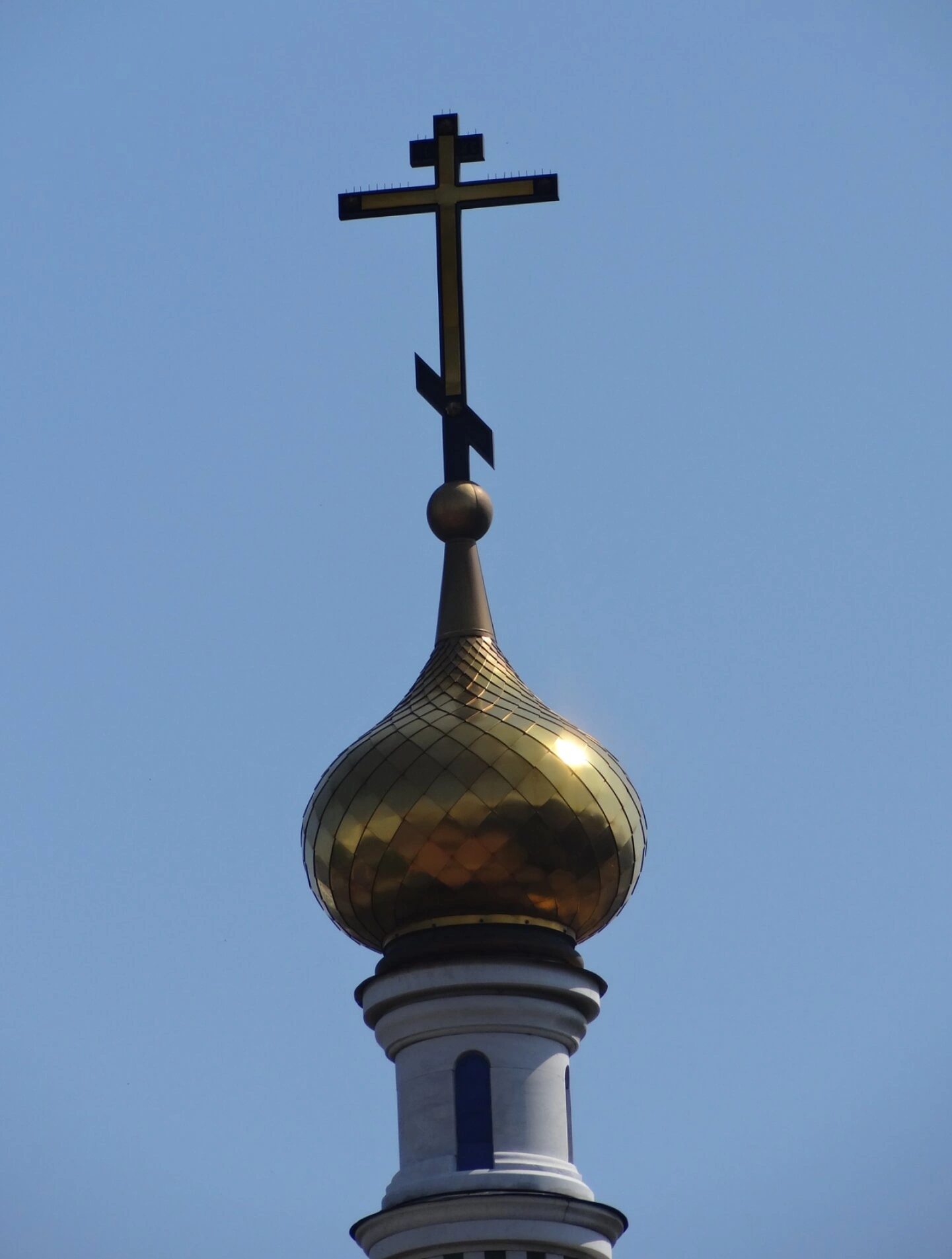 На фотографии запечатлён золотой купол-луковка и православный крест часовни Святой Екатерины в Екатеринбурге. Купол, увенчанный восьмиконечным крестом, установлен на цилиндрическом белом барабане и является центральным элементом архитектурного облика этой православной святыни. Он символизирует горение свечи и стремление к небесам, что характерно для традиционного русского храмового зодчества.