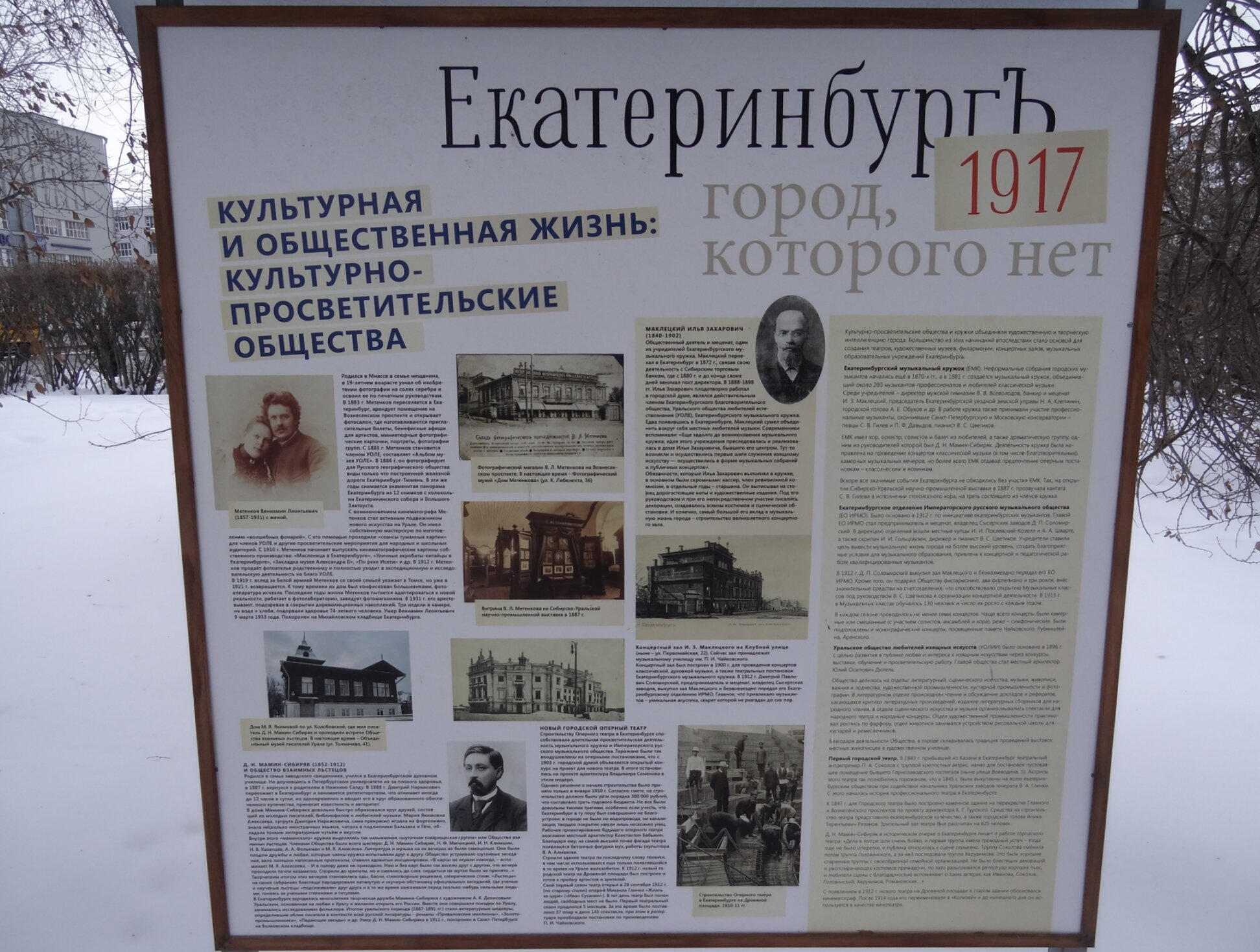 На представленной фотографии запечатлен информационный стенд, посвященный культурному и историческому наследию Екатеринбурга периода 1917 года. Центральное место в композиции стенда занимает историческое изображение часовни во имя святой великомученицы Екатерины – небесной покровительницы города.