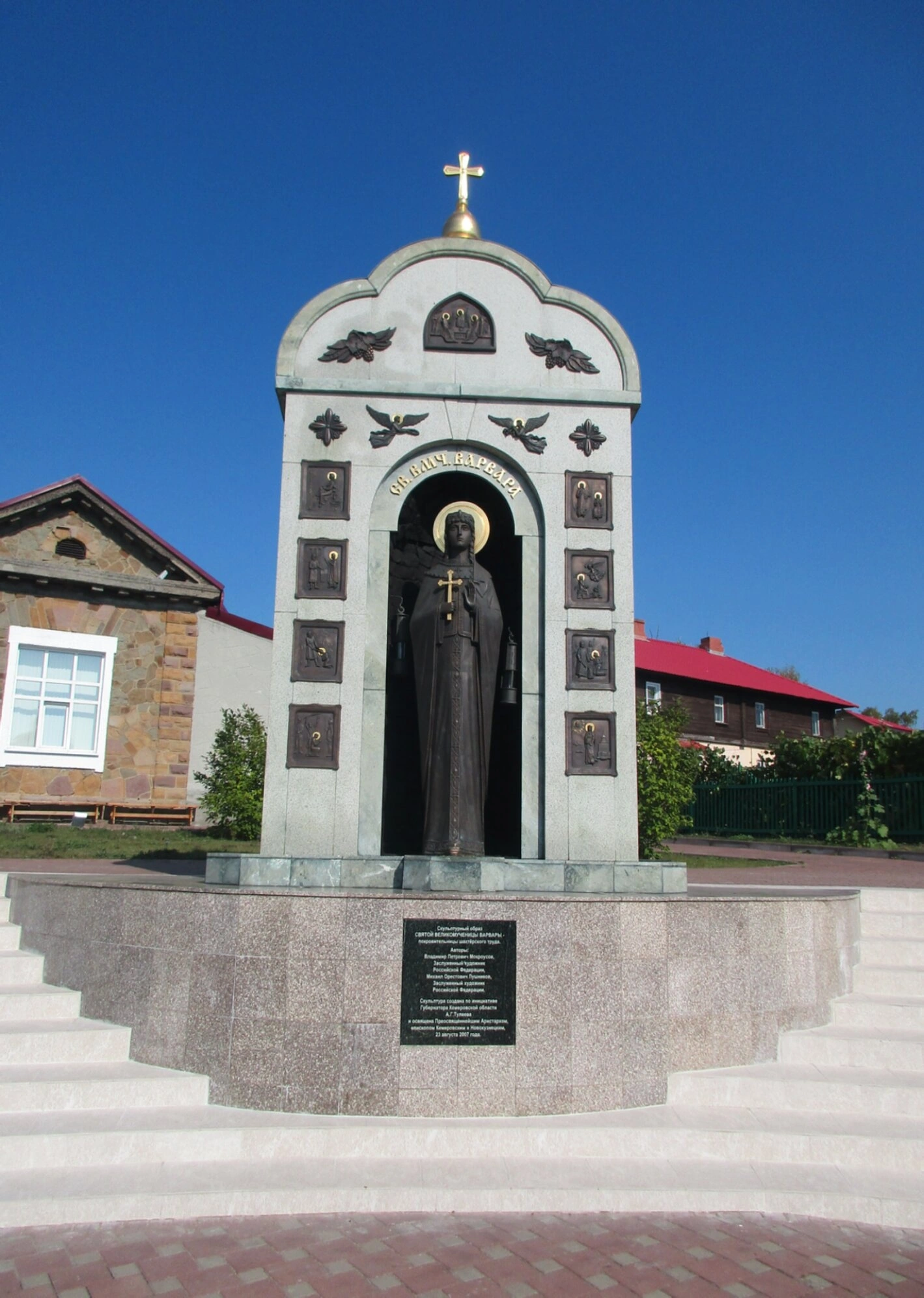 На фотографии запечатлена часовня-киворий в честь святой великомученицы Варвары, расположенная на территории музея-заповедника «Красная Горка» в Кемерове. Монументальная композиция, освящённая 22 августа 2007 года, создана скульпторами Михаилом Лушниковым и Владимиром Мокроусовым и является памятником монументального искусства регионального значения.