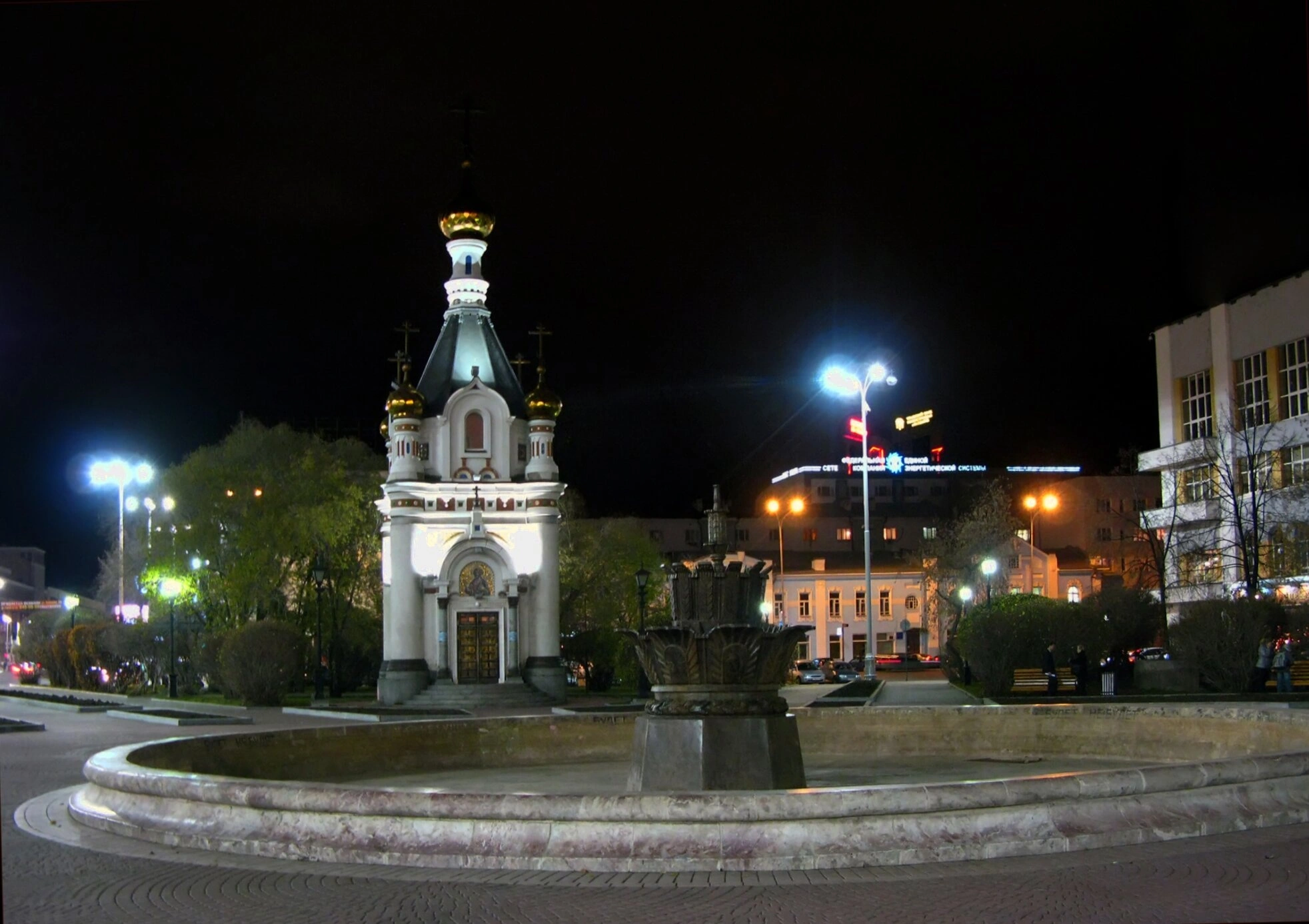 На переднем плане изображения виден круглый фонтан, который в тёмное время суток выполняет роль архитектурного обрамления для святыни. Водная гладь отражает огни ночного города и освещение самой часовни, создавая целостный и гармоничный образ. Окружающий ландшафт с деревьями и элементами благоустройства подчёркивает ухоженность и значимость этого места для горожан.