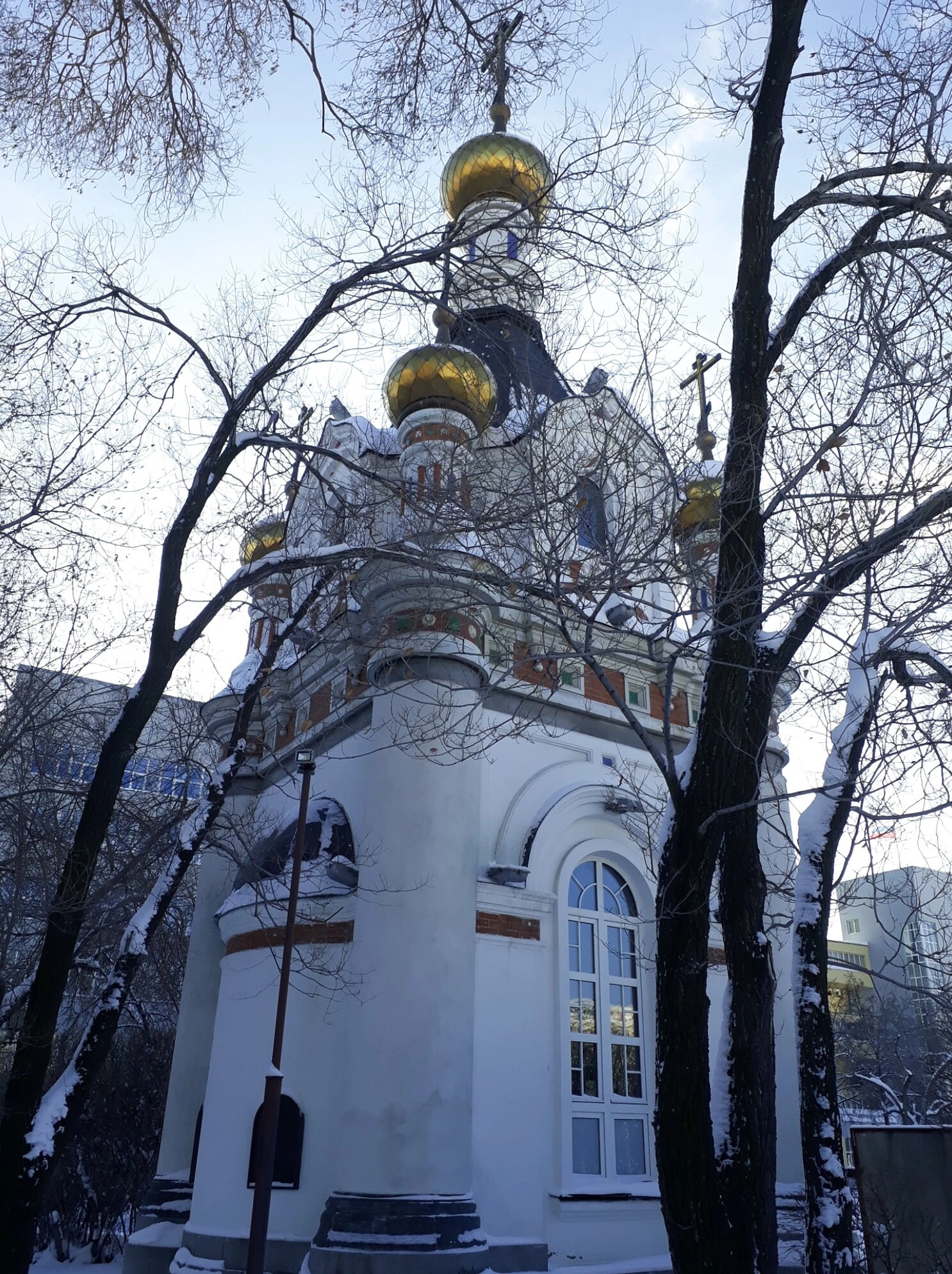 Белоснежные стены часовни и сияющие золотом купола с воздвигнутыми на них крестами являют собой образец традиционного русского церковного зодчества, гармонично вписанного в городской ландшафт. В ясный день золото главок сияет под лучами солнца, символизируя нетварный Божественный свет, а в зимнюю пору, как на снимке, весь образ наполнен смиренным и светлым ожиданием грядущего праздника Рождества Христова.