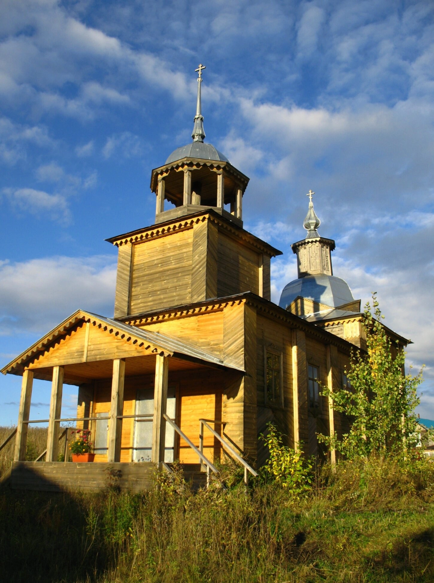 На представленной фотографии запечатлена часовня во имя святых первоверховных апостолов Петра и Павла, расположенная в селе Ыб Сыктывдинского района Республики Коми. Святыня возведена в лучших традициях русского северного зодчества и представляет собой образец деревянной храмовой архитектуры.