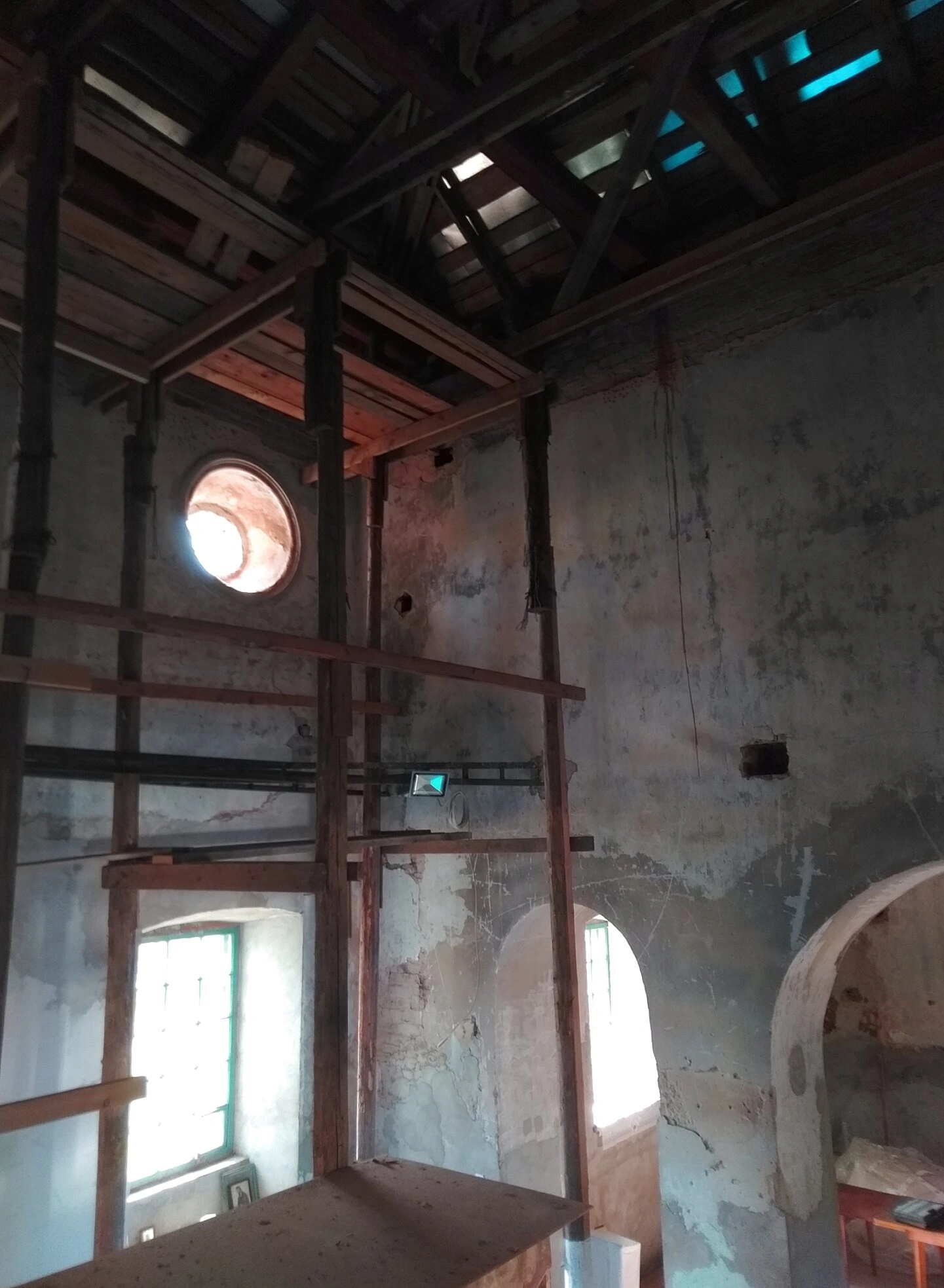 На фотографии запечатлён интерьер часовни, освящённой в честь Тихвинской иконы Божией Матери, что располагается в деревне Стегново. Внутреннее пространство храма находится на этапе реставрации, о чём свидетельствуют установленные деревянные леса, поддерживающие конструкцию. Свет проникает в помещение через арочные окна и круглое окно под потолком, освещая ветхую штукатурку на стенах и открытые деревянные балки перекрытия.