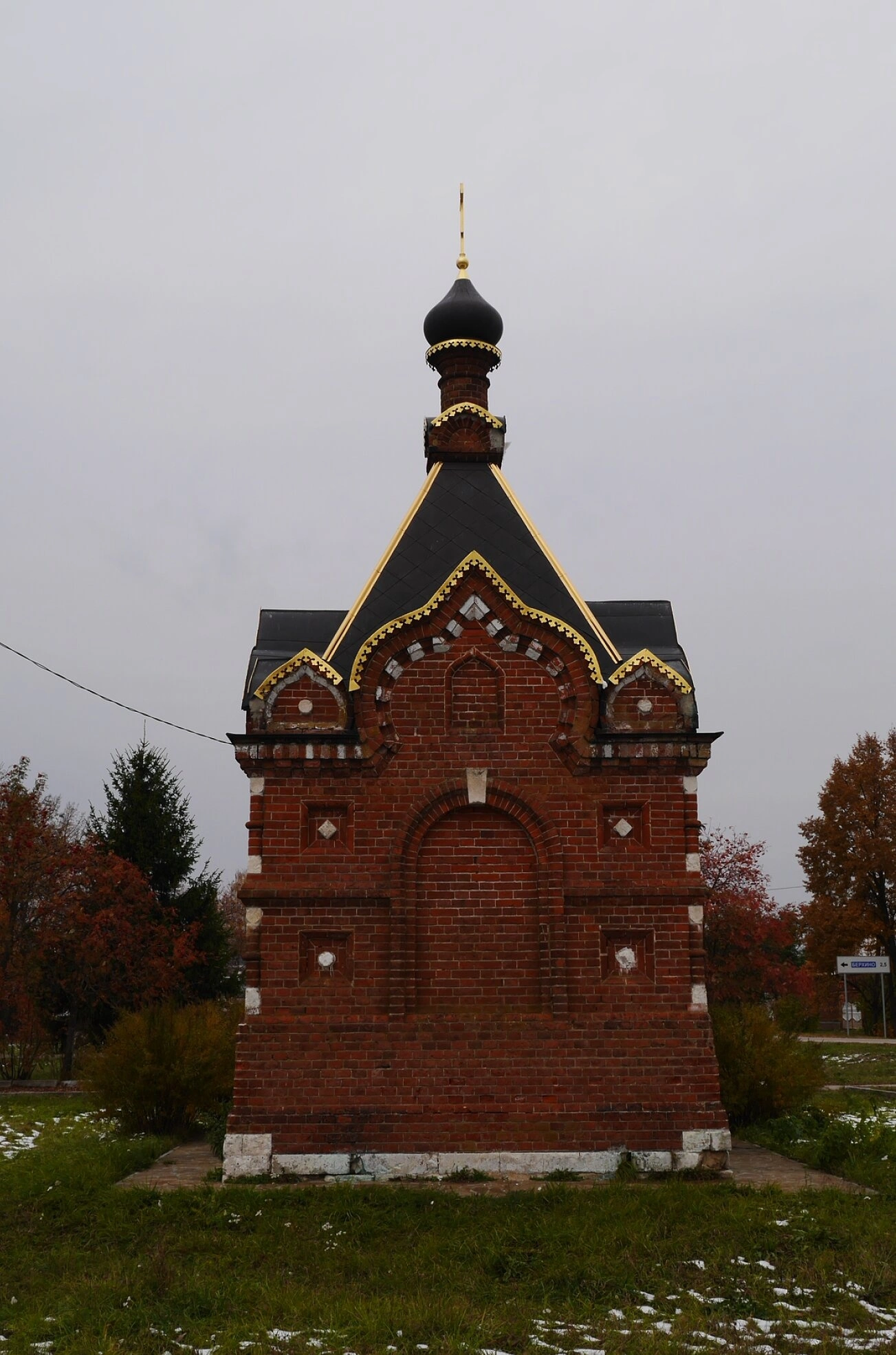 Часовня расположена на ухоженной территории с зелёным травяным покровом, на котором видны остатки снежного покрова, что указывает на ранневесенний или позднеосенний период съёмки. На заднем плане просматриваются деревья с осенней листвой и пасмурное небо, создающее особую атмосферу духовного умиротворения и покоя.