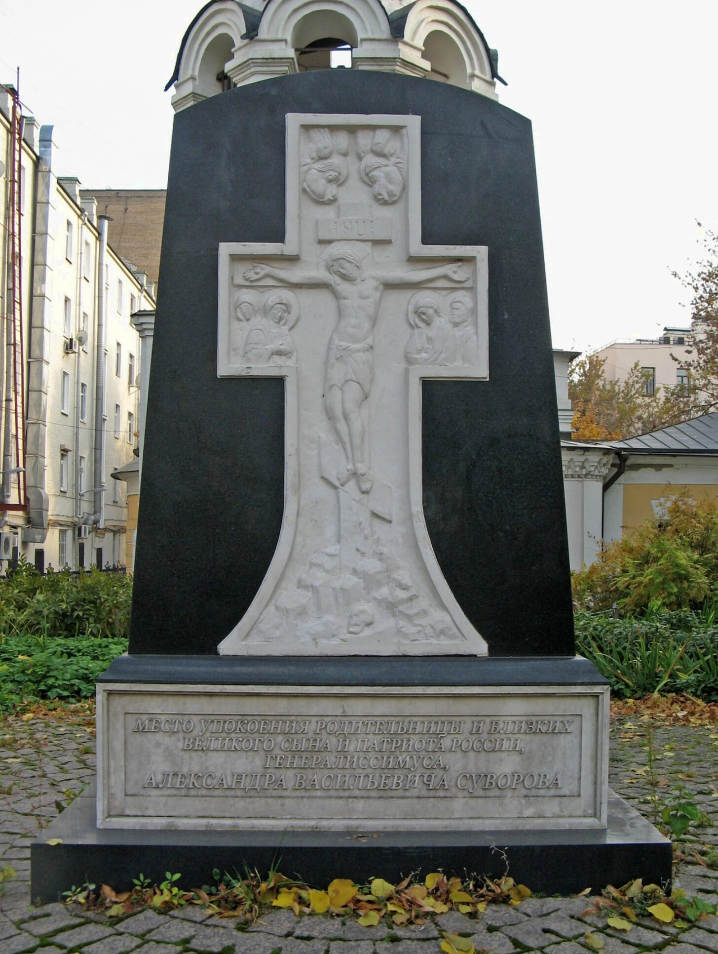На постаменте высечена памятная надпись, выполненная в дореволюционной орфографии: «МЕСТО УПОКОЕНИЯ РОДИТЕЛЬНИЦЫ И БЛИЗКИХ ВЕЛИКОГО СЫНА И ПАТРИОТА РОССИИ, ГЕНЕРАЛИССИМУСА, АЛЕКСАНДРА ВАСИЛЬЕВИЧА СУВОРОВА». Эта эпитафия свидетельствует о глубоком почитании памяти великого полководца и его семьи.